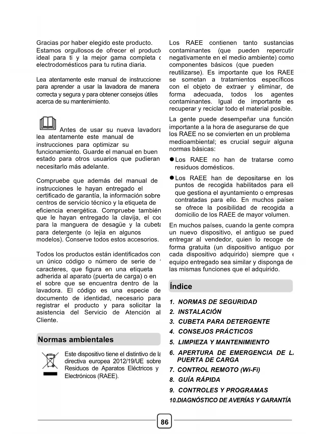 Gracias por haber elegido este producto. Estamos orgullosos de ofrecer el producto ideal para ti y la mejor gama completa de electrodomésticos para tu rutina diaria. Lea atentamente este manual de instrucciones para aprender a usar la lavadora de manera correcta y segura y para obtener consejos útiles acerca de su mantenimiento. Antes de usar su nueva lavadora, lea atentamente este manual de instrucciones para optimizar su funcionamiento. Guarde el manual en buen estado para otros usuarios que pudieran necesitarlo más adelante. Compruebe que además del manual de instrucciones le hayan entregado el certificado de garantía, la información sobre centros de servicio técnico y la etiqueta de eficiencia energética. Compruebe también que le hayan entregado la clavija, el codo para la manguera de desagüe y la cubeta para detergente (o lejía en algunos modelos). Conserve todos estos accesorios.