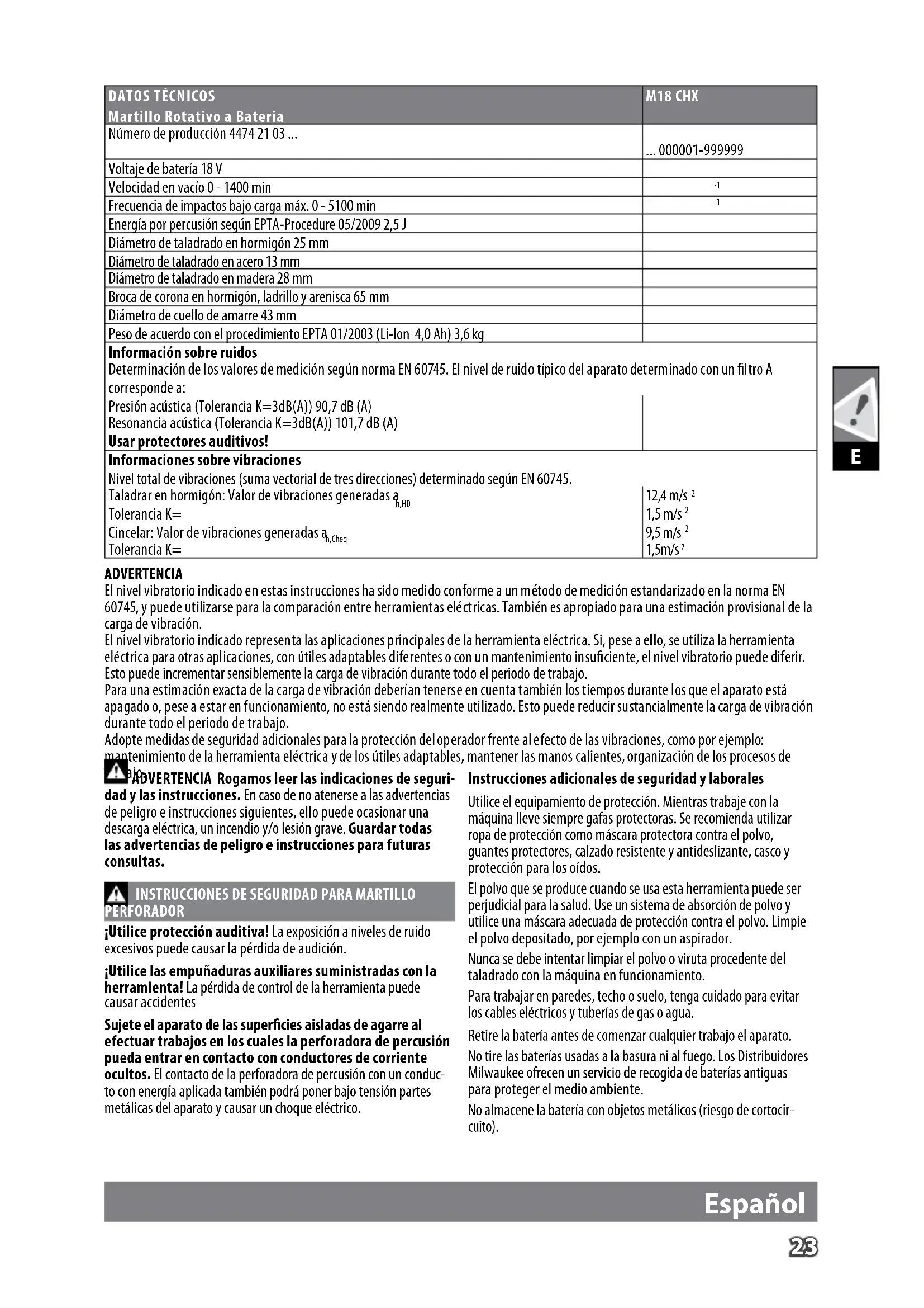 PERFORADOR ¡Utilice protección auditiva! La exposición a niveles de ruido excesivos puede causar la pérdida de audición. ¡Utilice las empuñaduras auxiliares suministradas con la herramienta! La pérdida de control de la herramienta puede causar accidentes Sujete el aparato de las supercies aisladas de agarre al efectuar trabajos en los cuales la perforadora de percusión pueda entrar en contacto con conductores de corriente ocultos. El contacto de la perforadora de percusión con un conduc- to con energía aplicada también podrá poner bajo tensión partes metálicas del aparato y causar un choque eléctrico. Instrucciones adicionales de seguridad y laborales Utilice el equipamiento de protección. Mientras trabaje con la máquina lleve siempre gafas protectoras. Se recomienda utilizar ropa de protección como máscara protectora contra el polvo, guantes protectores, calzado resistente y antideslizante, casco y protección para los oídos. El polvo que se produce cuando se usa esta herramienta puede ser perjudicial para la salud. Use un sistema de absorción de polvo y utilice una máscara adecuada de protección contra el polvo. Limpie el polvo depositado, por ejemplo con un aspirador. Nunca se debe intentar limpiar el polvo o viruta procedente del taladrado con la máquina en funcionamiento. Para trabajar en paredes, techo o suelo, tenga cuidado para evitar los cables eléctricos y tuberías de gas o agua. Retire la batería antes de comenzar cualquier trabajo el aparato. No tire las baterías usadas a la basura ni al fuego. Los Distribuidores Milwaukee ofrecen un servicio de recogida de baterías antiguas para proteger el medio ambiente. No almacene la batería con objetos metálicos (riesgo de cortocir- cuito).24