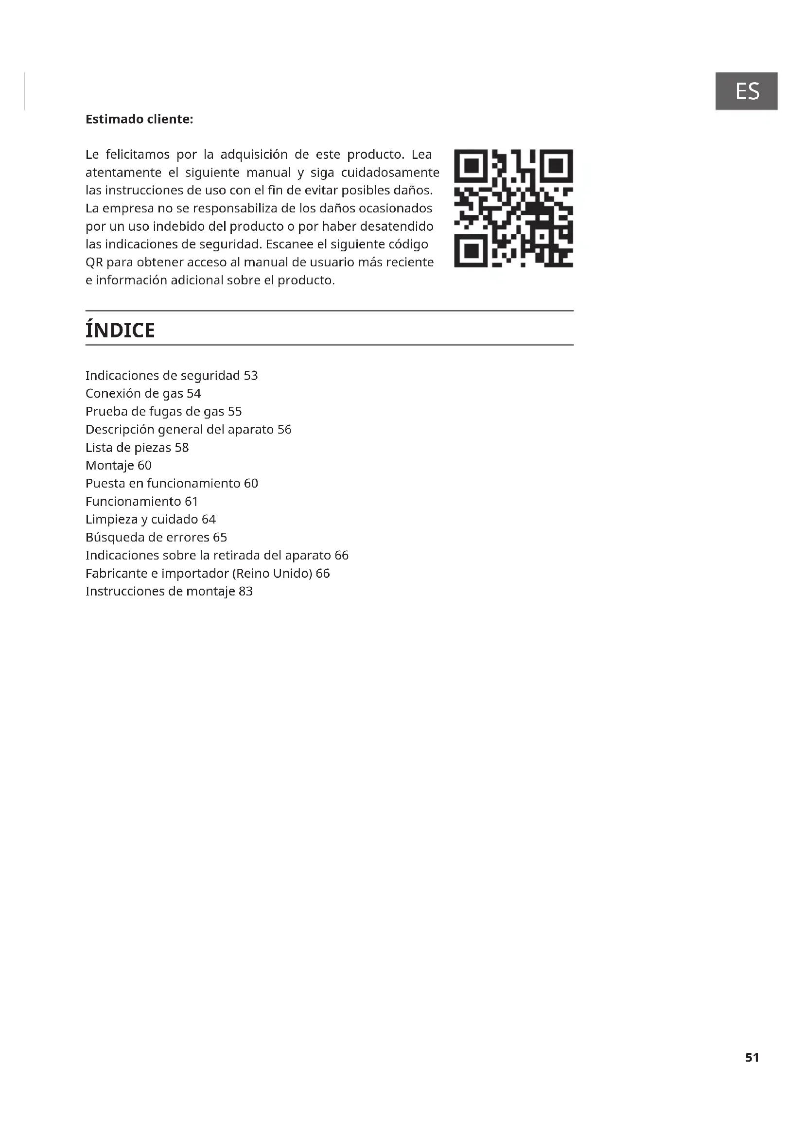 Estimado cliente: Le felicitamos por la adquisición de este producto. Lea atentamente el siguiente manual y siga cuidadosamente las instrucciones de uso con el n de evitar posibles daños. La empresa no se responsabiliza de los daños ocasionados por un uso indebido del producto o por haber desatendido las indicaciones de seguridad. Escanee el siguiente código QR para obtener acceso al manual de usuario más reciente e información adicional sobre el producto. ÍNDICE Indicaciones de seguridad 53 Conexión de gas 54 Prueba de fugas de gas 55 Descripción general del aparato 56 Lista de piezas 58 Montaje 60 Puesta en funcionamiento 60 Funcionamiento 61 Limpieza y cuidado 64 Búsqueda de errores 65 Indicaciones sobre la retirada del aparato 66 Fabricante e importador (Reino Unido) 66 Instrucciones de montaje 8352
