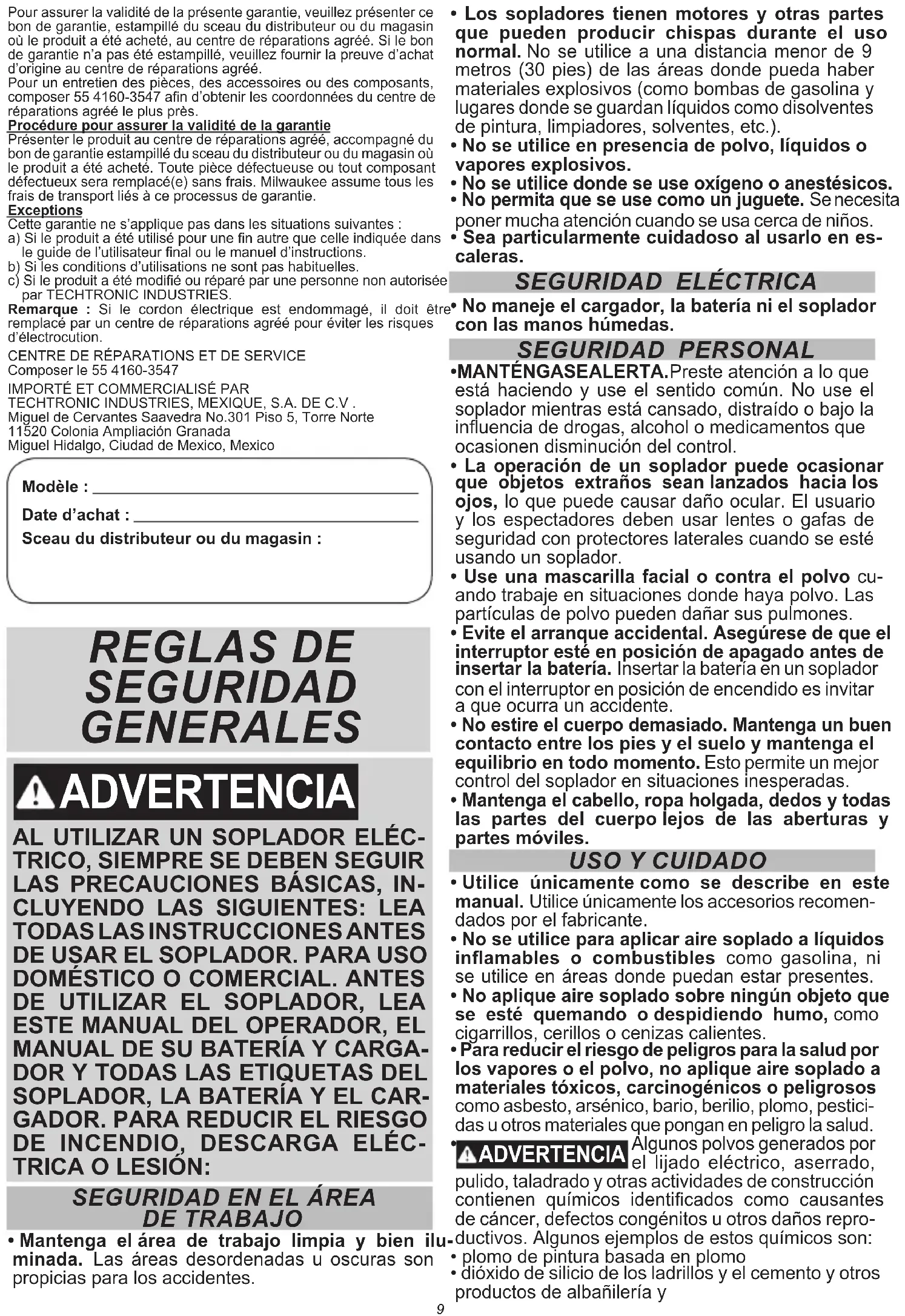 Techtronic Industries Mexico, S.A. de C.V. Av. Presidente Masarik 29 Piso 7 11560 Polanco V Seccion Miguel Hidalgo, Distrito Federal, México 01 (800) 030-7777 o (55) 4160-3540 Lunes a Viernes (9am a 6pm) O contáctanos en www.milwaukeetool.com.mx GARANTÍA LIMITADA - E.U.A. Y CANADÁ Cada herramienta eléctrica* de MILWAUKEE (ver excepciones a continuación) está garantizada para el comprador original únicamente de que no tenga material y mano de obra defectuosos. Sujeto a ciertas excepciones, MILWAUKEE reparará o reemplazará cualquier parte en una herramienta eléctrica que tenga defectos de material o mano de obra según lo determine MILWAUKEE mediante una revisión, por un periodo de cinco (5) años** después de la fecha de compra a menos que se indique lo contrario. Al devolver la herramienta eléctrica a un Centro de Servicio de la fábrica de MILWAUKEE o a una Estación de Servicio Autorizada de MILWAUKEE, se requiere que el ete esté pagado por adelantado y asegurado. Se debe incluir una copia del comprobante de compra con el producto devuelto. Esta garantía no aplica a daños que MILWAUKEE determine que son ocasionados por reparaciones o intentos de reparaciones realizados por una persona que no sea personal autorizado de MILWAUKEE, uso indebido, alteraciones, maltrato, desgaste normal, falta de mantenimiento o accidentes. Desgaste normal: Muchas herramientas eléctricas necesitan un reemplazo periódico de partes y servicio para lograr el mejor des- empeño. Esta garantía no cubre la reparación cuando el uso normal ha agotado la vida de una parte, incluyendo sin limitar a mandriles, cepillos, cables, zapatas de la sierra, abrazaderas de la hoja, anillos en O, sellos, protectores, hojas de desatornilladores, pistones, herrajes, levantadores y arandelas de cubierta de los protectores. *Esta garantía no cubre clavadoras y grapadoras neumáticas, pistola de pintura a presión, baterías inalámbricas, generadores de energía portátil de gasolina, herramientas de mano, palanca y cadena de mano de polipasto - eléctricas, indumentaria calefactada M12™, producto reacondicionado y productos de prueba y medición. Existen garantías por separado y distintas disponibles para estos productos. **El periodo de garantía para los radios para obra, puerto de energía M12™, fuente de poder M18™, ventiladores para obra y carretillas de trabajo industrial Trade Titan™ es de un (1) año a partir de la fecha de compra. El periodo de garantía para los Cables de limpieza de drenaje es de dos (2) años a partir de la fecha de compra. El periodo de garantía de la Pistola de calor compacta M18™ de la Extractor de polvo de 8 galones es de tres (3) años a partir de la fecha de com- pra. El periodo de garantía de las lámparas de LED en la Lámpara de trabajo LED y el Bulbo mejorado de LED para la Luz de trabajo es por la vida del producto sujeto a las limitaciones anteriores. Si durante el uso normal el LED o Bulbo de LED falla, la parte será reemplazada sin cargo. No se requiere el registro de la garantía para obtener la garantía cor- respondiente a un producto de herramienta eléctrica de MILWAUKEE. La fecha de manufactura del producto se utilizará para determinar el periodo de garantía si no se proporciona comprobante de compra al solicitar el servicio en garantía. LA ACEPTACIÓN DE LOS REMEDIOS EXCLUSIVOS DE REPA- RACIÓN Y REEMPLAZO AQUÍ DESCRITOS ES UNA CONDICIÓN DEL CONTRATO PARA LA COMPRA DE TODO PRODUCTO DE MILWAUKEE. SI USTED NO ACEPTA ESTA CONDICIÓN, NO DEBE COMPRAR EL PRODUCTO. MILWAUKEE NO SERÁ RESPON- SABLE EN NINGÚN CASO DE DAÑOS INCIDENTALES, ESPE- CIALES, EMERGENTES O PUNITIVOS NI DE NINGÚN COSTO, HONORARIOS LEGALES, GASTOS, PÉRDIDAS O DEMORAS ALE- GADOS COMO CONSECUENCIA DE ALGÚN DAÑO, FALLA O DE- FECTO EN NINGÚN PRODUCTO, INCLUYENDO, ENTRE OTROS, RECLAMACIONES POR PÉRDIDA DE UTILIDADES. ALGUNOS ESTADOS NO PERMITEN LA EXCLUSIÓN O LIMITACIÓN DE RE- SPONSABILIDAD POR DAÑOS INCIDENTALES O EMERGENTES, POR LO QUE LA ANTERIOR LIMITACIÓN O EXCLUSIÓN PODRÍA NO APLICARSE EN SU CASO. ESTA GARANTÍA ES EXCLUSIVA Y REEMPLAZA TODAS LAS DEMÁS GARANTÍAS EXPRESAS, ES- CRITAS U ORALES. EN LA MEDIDA EN QUE LO PERMITA LA LEY, MILWAUKEE DESCONOCE CUALQUIER GARANTÍA IMPLÍCITA, INCLUYENDO SIN LIMITACIÓN CUALQUIER GARANTÍA IMPLÍCITA DE COMERCIABILIDAD O IDONEIDAD PARA UN FIN O USO ESPE- CÍFICO; EN LA MEDIDA EN QUE DICHO DESCONOCIMIENTO NO SEA PERMITIDO POR LA LEY, DICHAS GARANTÍAS IMPLÍCITAS SE LIMITAN A LA DURACIÓN DE LA GARANTÍA EXPRESA COR- RESPONDIENTE SEGÚN SE DESCRIBIÓ ANTERIORMENTE.