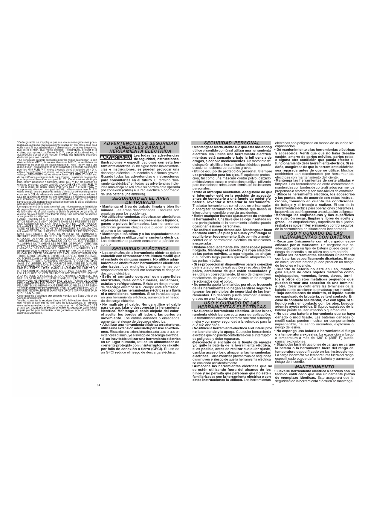 Techtronic Industries Mexico, S.A. de C.V. Av. Presidente Masarik 29 Piso 7 11560 Polanco V Seccion Miguel Hidalgo, Distrito Federal, México 01 (800) 030-7777 o (55) 4160-3540 Lunes a Viernes (9am a 6pm) O contáctanos en www.milwaukeetool.com.mx GARANTÍA LIMITADA - E.U.A. Y CANADÁ Cada herramienta eléctrica* de MILWAUKEE (ver excepciones a continuación) está garantizada para el comprador original únicamente de que no tenga material y mano de obra defectuosos. Sujeto a ciertas excepciones, MILWAUKEE reparará o reemplazará cualquier parte en una herramienta eléctrica que tenga defectos de material o mano de obra según lo determine MILWAUKEE mediante una revisión, por un periodo de cinco (5) años** después de la fecha de compra a menos que se indique lo contrario. Al devolver la herramienta eléctrica a un Centro de Servicio de la fábrica de MILWAUKEE o a una Estación de Servicio Autorizada de MILWAUKEE, se requiere que el fl ete esté pagado por adelantado y asegurado. Se debe incluir una copia del comprobante de compra con el producto devuelto. Esta garantía no aplica a daños que MILWAUKEE determine que son ocasionados por reparaciones o intentos de reparaciones realizados por una persona que no sea personal autorizado de MILWAUKEE, uso indebido, alteraciones, maltrato, desgaste normal, falta de mantenimiento o accidentes. Desgaste normal: Muchas herramientas eléctricas necesitan un reemplazo periódico de partes y servicio para lograr el mejor des- empeño. Esta garantía no cubre la reparación cuando el uso normal ha agotado la vida de una parte, incluyendo sin limitar a mandriles, cepillos, cables, zapatas de la sierra, abrazaderas de la hoja, anillos en O, sellos, protectores, hojas de desatornilladores, pistones, herrajes, levantadores y arandelas de cubierta de los protectores. *Esta garantía no cubre clavadoras y grapadoras neumáticas, pistola de pintura a presión, baterías inalámbricas, generadores de energía portátil de gasolina, herramientas de mano, palanca y cadena de mano de polipasto - eléctricas, indumentaria calefactada M12™, producto reacondicionado y productos de prueba y medición. Existen garantías por separado y distintas disponibles para estos productos. **El periodo de garantía para los radios para obra, puerto de energía M12™, fuente de poder M18™, ventiladores para obra y carretillas de trabajo industrial Trade Titan™ es de un (1) año a partir de la fecha de compra. El período de garantía para los M18 FUEL™ 1" llaves de impacto de alto torque con d en empuñadura, cables de limpieza de drenaje y AIRSNAKE™ los accesorios de pistola de aire de limpieza de drenaje, y los niveles láser mediante USB REDLITHIUM