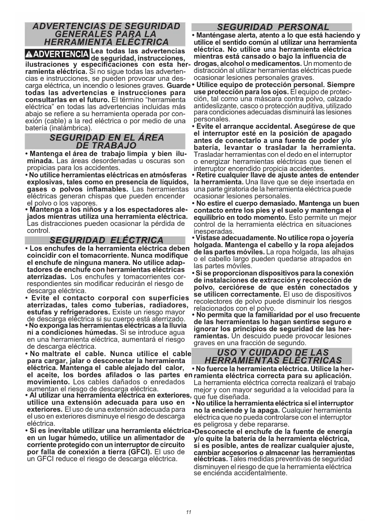 - Si es inevitable utilizar una herramienta eléctrica en un lugar húmedo, utilice un alimentador de corriente protegido con un interruptor de circuito por falla de conexión a tierra (GFCI). El uso de un GFCI reduce el riesgo de descarga eléctrica. SEGURIDAD PERSONAL