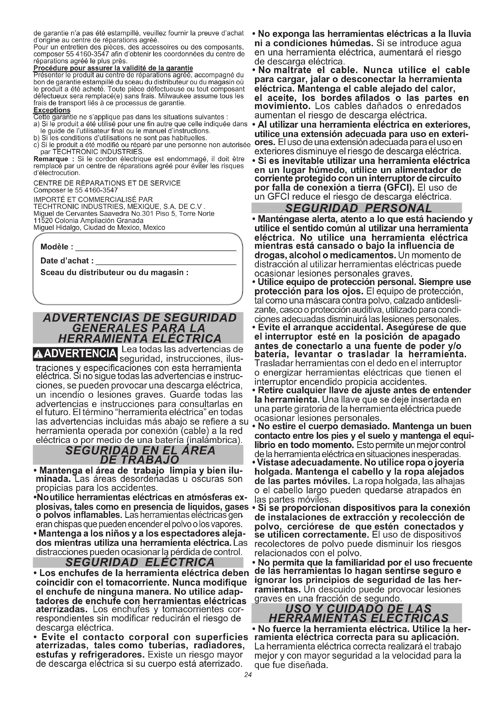 Techtronic Industries Mexico, S.A. de C.V. Av. Presidente Masarik 29 Piso 7 11560 Polanco V Seccion Miguel Hidalgo, Distrito Federal, México 01 (800) 030-7777 o (55) 4160-3540 Lunes a Viernes (9am a 6pm) O contáctanos en www.milwaukeetool.com.mx GARANTÍA LIMITADA - E.U.A. Y CANADÁ Cada herramienta eléctrica* MILWAUKEE (vea las excepciones más adelante) se garantiza al comprador original únicamente contra de- fectos en materiales y mano de obra. Sujeto a ciertas excepciones, MILWAUKEE reparará o reemplazará cualquier parte de una herra- mienta eléctrica que, tras una revisión, MILWAUKEE determine que tiene defectos en material o mano de obra durante un período de cinco (5) años** después de la fecha de compra, a menos que se indique lo contrario. Se requiere que se envíe la herramienta eléctrica a un Centro de Servicio de fábrica de MILWAUKEE o a una Estación de Servicio Autorizada de MILWAUKEE, con ete prepagado y asegurado. Debe incluirse una copia del comprobante de compra con el producto enviado. Esta garantía no aplica a daños que MILWAUKEE determine que son ocasionados por reparaciones o intentos de reparaciones realizados por una persona que no sea personal autorizado de MILWAUKEE, uso indebido, alteraciones, maltrato, desgaste normal, falta de mantenimiento o accidentes. Desgaste normal: Muchas herramientas eléctricas necesitan reem- plazos periódicos de partes y servicio para lograr el mejor rendimiento. Esta garantía no cubre la reparación cuando el uso normal ha agotado la vida útil de una parte, incluyendo, entre otras, mandriles, cepillos, cables, zapatas de sierra, abrazaderas de hoja, juntas tóricas, sellos, parachoques, cuchillas de propulsión, pistones, percutores, elevadores y arandelas de la cubierta del parachoques. *Esta garantía no cubre las clavadoras y grapadoras neumáticas, pulverizador de pintura sin aire, baterías inalámbricas, generadores portátiles accionados por gasolina, herramientas manuales, polipasto eléctrico, de palanca y cadena manual, prendas calefactadas M12™; productos reacondicionados, y productos de prueba y medición. Hay garantías independientes y distintas disponibles para estos productos. **El periodo de garantía de los radios para obra, puerto de energía M12™, fuente de poder M18™, ventilador para obra y carros de trabajo industriales Trade Titan™ es de un (1) año a partir de la fecha de compra. El periodo de garantía de los cables de limpieza de drenaje es de dos (2) años desde la fecha de compra. El periodo de garantía del LED de la lámpara de trabajo LED y el foco de cambio a LED para la lámpara de trabajo es por toda la vida del producto, sujeto a las limitaciones mencionadas anteriormente. Si durante el uso normal falla el LED o el foco LED, la parte se reemplazará sin cargo alguno. No es necesario el registro de la garantía para obtener la garantía cor- respondiente para un producto de herramienta eléctrica MILWAUKEE. La fecha de manufactura del producto se utilizará para determinar el periodo de garantía si no se proporciona comprobante de compra al solicitar el servicio en garantía. LA ACEPTACIÓN DE LOS REMEDIOS EXCLUSIVOS DE REPA- RACIÓN Y REEMPLAZO AQUÍ DESCRITOS ES UNA CONDICIÓN DEL CONTRATO PARA LA COMPRA DE TODO PRODUCTO DE MILWAUKEE. SI USTED NO ACEPTA ESTA CONDICIÓN, NO DEBE COMPRAR EL PRODUCTO. MILWAUKEE NO SERÁ RESPONSABLE EN NINGÚN CASO DE DAÑOS INCIDENTALES, ESPECIALES, EMERGENTES O PUNITIVOS, NI DE NINGÚN COSTO, HONORARIOS LEGALES, GASTOS, PÉRDIDAS O DE- MORAS ALEGADOS COMO CONSECUENCIA DE ALGÚN DAÑO, FALLA O DEFECTO EN NINGÚN PRODUCTO, INCLUYENDO, ENTRE OTROS, RECLAMACIONES POR PÉRDIDA DE UTILI- DADES. ALGUNOS ESTADOS NO PERMITEN LA EXCLUSIÓN O LIMITACIÓN DE RESPONSABILIDAD POR DAÑOS INCIDENTALES O EMERGENTES, POR LO QUE LA ANTERIOR LIMITACIÓN O EX- CLUSIÓN PODRÍA NO APLICARSE EN SU CASO. ESTA GARANTÍA ES EXCLUSIVA Y REEMPLAZA TODAS LAS DEMÁS GARANTÍAS EXPRESAS, ESCRITAS U ORALES. EN LA MEDIDA EN QUE LO PERMITA LA LEY, MILWAUKEE DESCONOCE CUALQUIER GA- RANTÍA IMPLÍCITA, INCLUYENDO, SIN LIMITACIÓN, CUALQUIER GARANTÍA IMPLÍCITA DE COMERCIABILIDAD O IDONEIDAD PARA UN FIN O USO ESPECÍFICO; EN LA MEDIDA EN QUE DICHO DESCONOCIMIENTO NO SEA PERMITIDO POR LA LEY, DICHAS GARANTÍAS IMPLÍCITAS SE LIMITAN A LA DURACIÓN DE LA GA- RANTÍA EXPRESA CORRESPONDIENTE SEGÚN SE DESCRIBIÓ