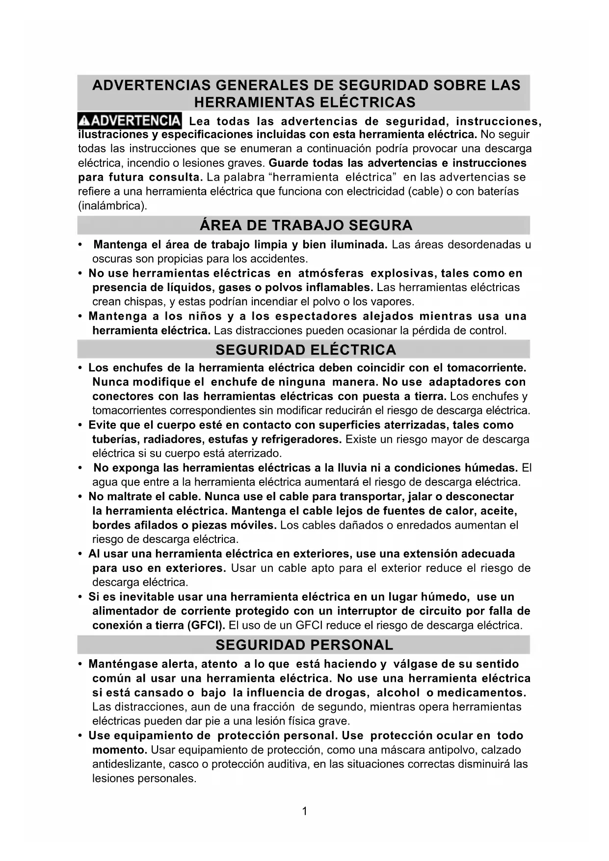 - Si es inevitable usar una herramienta eléctrica en un lugar húmedo, use un alimentador de corriente protegido con un interruptor de circuito por falla de conexión a tierra (GFCI). El uso de un GFCI reduce el riesgo de descarga eléctrica. SEGURIDAD PERSONAL