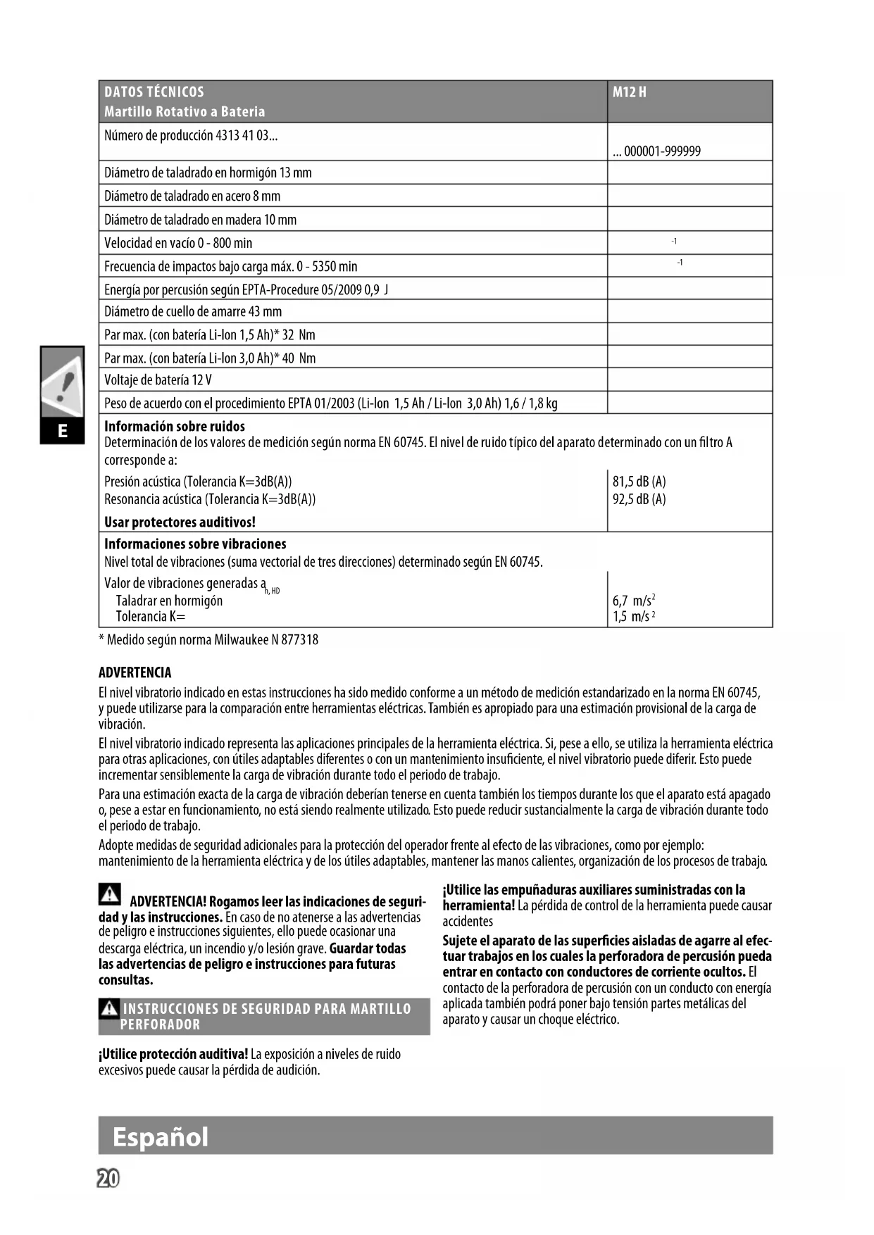 - Medido según norma Milwaukee N 877318 ADVERTENCIA El nivel vibratorio indicado en estas instrucciones ha sido medido conforme a un método de medición estandarizado en la norma EN 60745, y puede utilizarse para la comparación entre herramientas eléctricas. También es apropiado para una estimación provisional de la carga de vibración. El nivel vibratorio indicado representa las aplicaciones principales de la herramienta eléctrica. Si, pese a ello, se utiliza la herramienta eléctrica para otras aplicaciones, con útiles adaptables diferentes o con un mantenimiento insuciente, el nivel vibratorio puede diferir. Esto puede incrementar sensiblemente la carga de vibración durante todo el periodo de trabajo. Para una estimación exacta de la carga de vibración deberían tenerse en cuenta también los tiempos durante los que el aparato está apagado o, pese a estar en funcionamiento, no está siendo realmente utilizado. Esto puede reducir sustancialmente la carga de vibración durante todo el periodo de trabajo. Adopte medidas de seguridad adicionales para la protección del operador frente al efecto de las vibraciones, como por ejemplo: mantenimiento de la herramienta eléctrica y de los útiles adaptables, mantener las manos calientes, organización de los procesos de trabajo.21