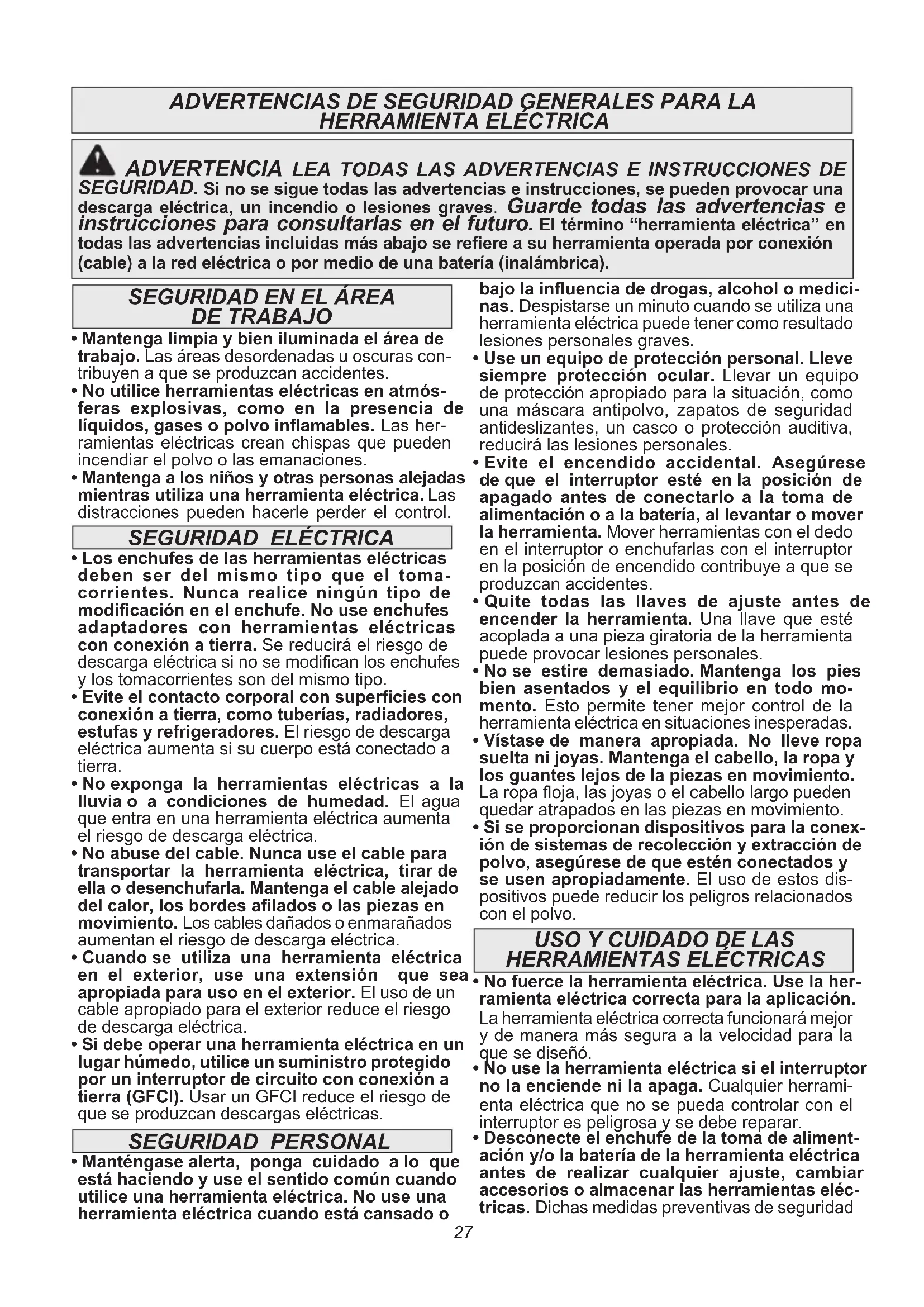 ADVERTENCIA LEA TODAS LAS ADVERTENCIAS E INSTRUCCIONES DE SEGURIDAD. Si no se sigue todas las advertencias e instrucciones, se pueden provocar una descarga eléctrica, un incendio o lesiones graves. Guarde todas las advertencias e instrucciones para consultarlas en el futuro. El término “herramienta eléctrica” en todas las advertencias incluidas más abajo se reere a su herramienta operada por conexión (cable) a la red eléctrica o por medio de una batería (inalámbrica).