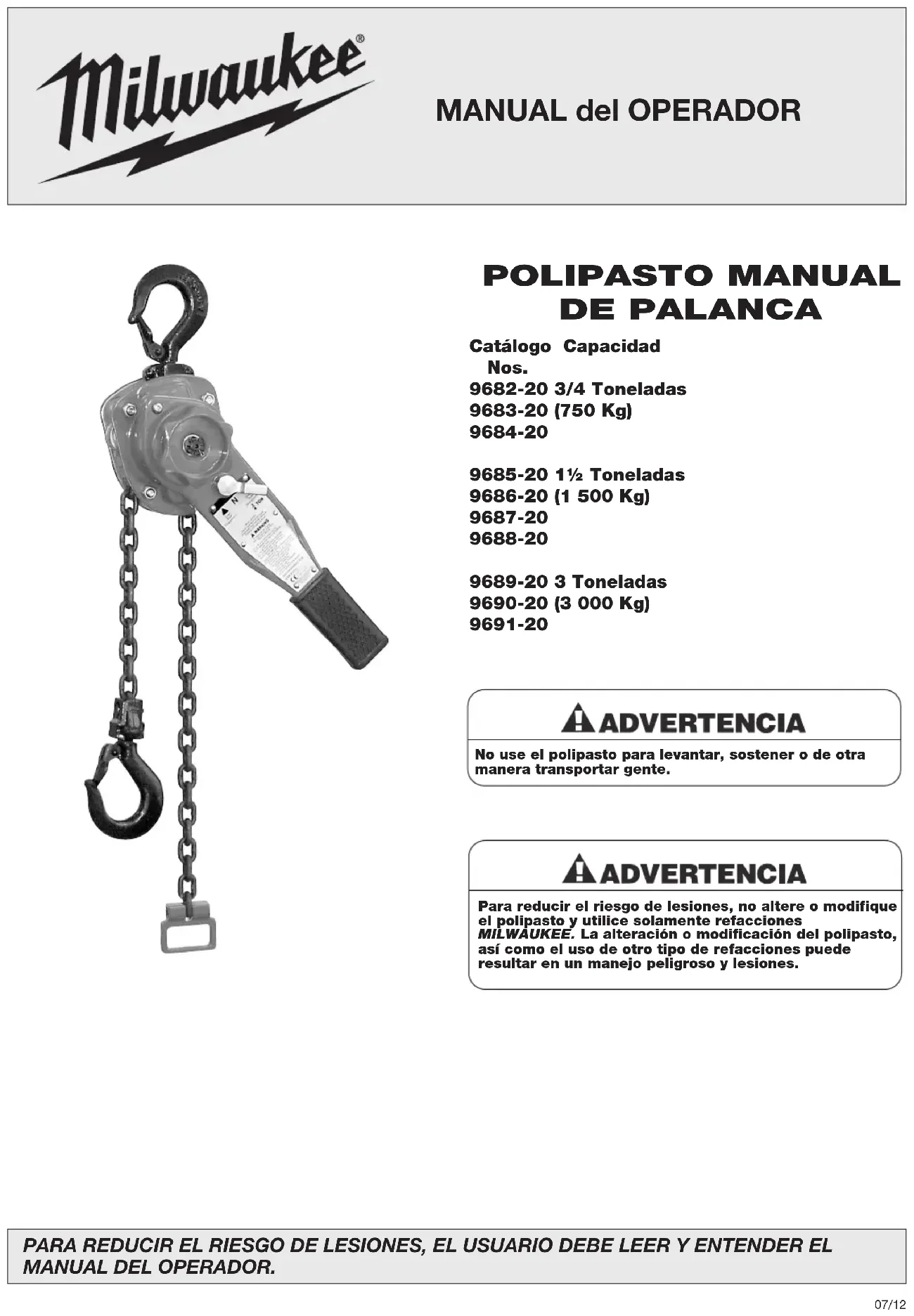Rafael Buelna No.1. Col. Tezozomoc Mexico, Azcapotzalco D.F. Ph. 01 800 832 1949 IMPORTED AND COMMERCIALIZED BY: TECHTRONIC INDUSTRIES MEXICO, .S.A. DE C.V. Av. Santa Fe 481 piso 6, Col. Curz Manca. CP 05349, Cuajimalpa, D.F. Model: Date of Purchase: Distributor or Store Stamp:No use el polipasto para levantar, sostener o de otra manera transportar gente. Catálogo Capacidad Nos. 9682-20 3/4 Toneladas 9683-20 (750 Kg) 9684-20 9685-20 1½ Toneladas 9686-20 (1 500 Kg) 9687-20 9688-20 9689-20 3 Toneladas 9690-20 (3 000 Kg) 9691-20 POLIPASTO MANUAL DE PALANCA Para reducir el riesgo de lesiones, no altere o modifique el polipasto y utilice solamente refacciones MILWAUKEE. La alteración o modificación del polipasto, así como el uso de otro tipo de refacciones puede resultar en un manejo peligroso y lesiones. 07/12 MANUAL del OPERADOR PARA REDUCIR EL RIESGO DE LESIONES, EL USUARIO DEBE LEER Y ENTENDER EL