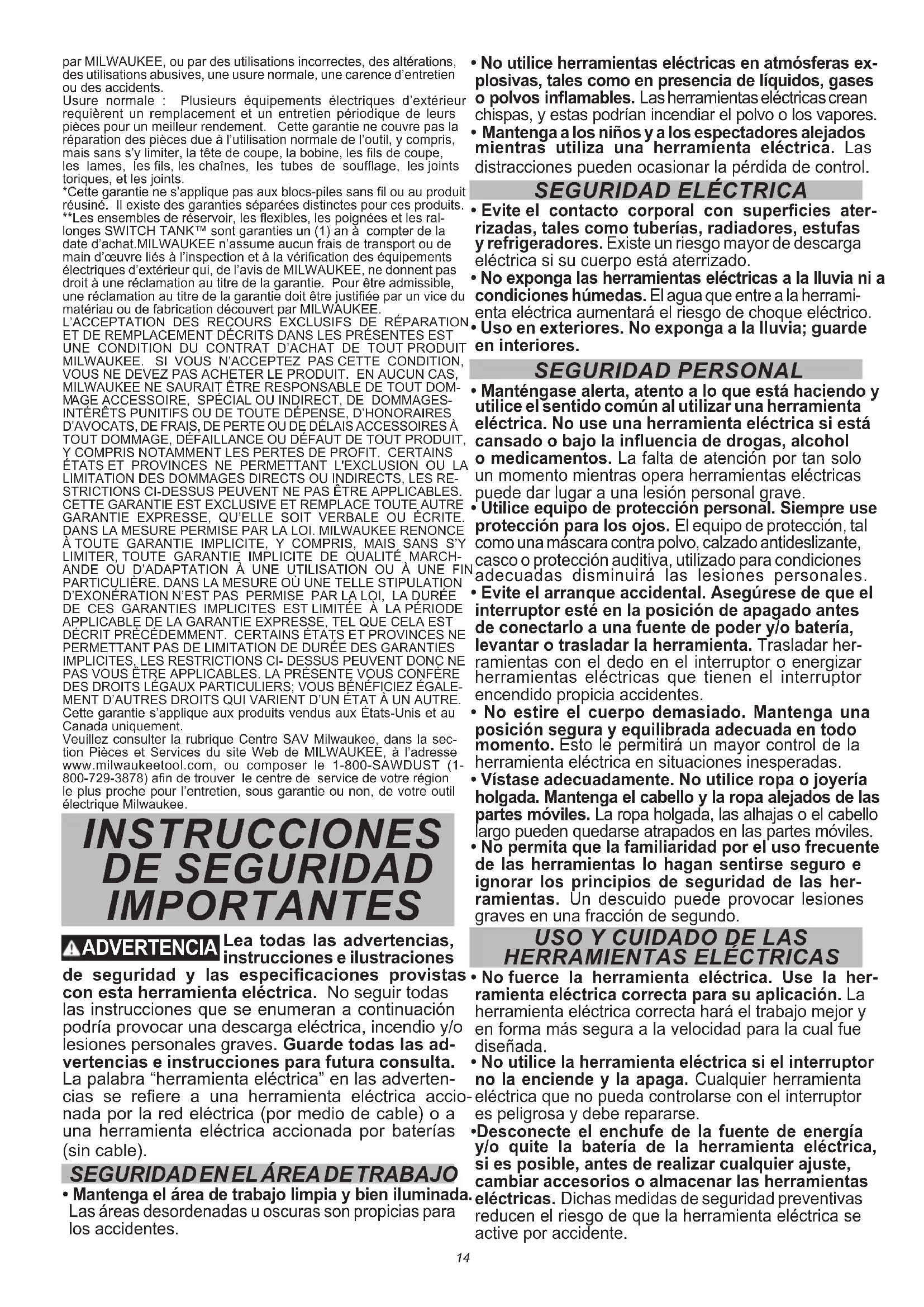 Cada producto de equipos electricos para el exterior de MILWAUKEE (ver exceptiones a continuación) Tiene garantía solamente con el comprador original contra defectos del material y calidad. Sujeto a ciertas exceptiones, MILWAUKEE reparar o reemplazaríarialquier parte de un producto de equipos electricos para el exterior que, despues de examinarse, sea determinado por MILWAUKEE que tenen material o calidad defectuoso durante un periodo de tres (3) años* afterwards of la Fecha de compra a menos que se estipule lo contrario. Se requiere la devolución del equipo electrico para el exterior a un lugar del Centro de service de una fabrica MILWAUKEE or Estación de servicios autorizzato MILWAUKEE, con el flete pagado por anticipado y asegurado. Debera incluirse una copia del comprobante de compra con la devolución del producto.Esta garantía no aplica a daniosque MILWAUKEE determine provengan de reparaciones ointentos de reparaciones realizados por alguien que no sea personal autorizzato de MILWAUKEE, por mal uso, alteraciones, abuso, deterioro normal, falta de mantenimiento o accidentes.