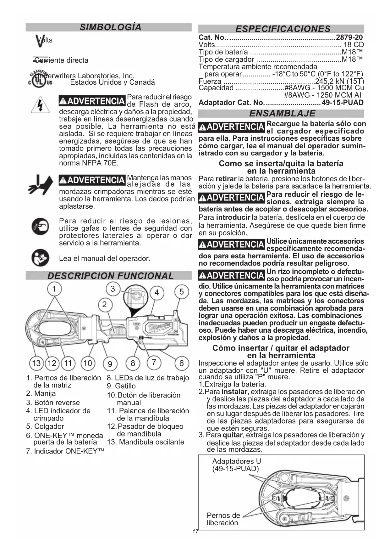 Adaptador Cat. No. ........................... 49-15-PUAD ENSAMBLAJE ADVERTENCIA Recargue la batería sólo con el cargador especificado para ella. Para instrucciones especícas sobre cómo cargar, lea el manual del operador sumin- istrado con su cargador y la batería. Como se inserta/quita la batería en la herramienta Para retirar la batería, presione los botones de liber- ación y jale de la batería para sacarla de la herramienta. ADVERTENCIA Para reducir el riesgo de le- siones, extraiga siempre la batería antes de acoplar o desacoplar accesorios. Para introducir la batería, deslícela en el cuerpo de la herramienta. Asegúrese de que quede bien rme en su posición. ADVERTENCIA Utilice únicamente accesorios especícamente recomenda- dos para esta herramienta. El uso de accesorios no recomendados podría resultar peligroso. ADVERTENCIA Un rizo incompleto o defectu- oso podría provocar un incen- dio. Utilice únicamente la herramienta con matrices y conectores compatibles para los que está diseña- da. Las mordazas, las matrices y los conectores deben usarse en una combinación aprobada para lograr una operación exitosa. Las combinaciones inadecuadas pueden producir un engaste defectu- oso. Puede haber una descarga eléctrica, incendio, explosión y daños a la propiedad. Cómo insertar / quitar el adaptador en la herramienta Inspeccione el adaptador antes de usarlo. Utilice sólo un adaptador con "U" muere. Retire el adaptador cuando se utiliza "P" muere. 1.Extraiga la batería. 2.Para instalar, extraiga los pasadores de liberación y deslice las piezas del adaptador a cada lado de las mordazas. Las piezas del adaptador encajarán en su lugar después de liberar los pasadores. Tire de las piezas adaptadoras para asegurarse de que estén seguras.