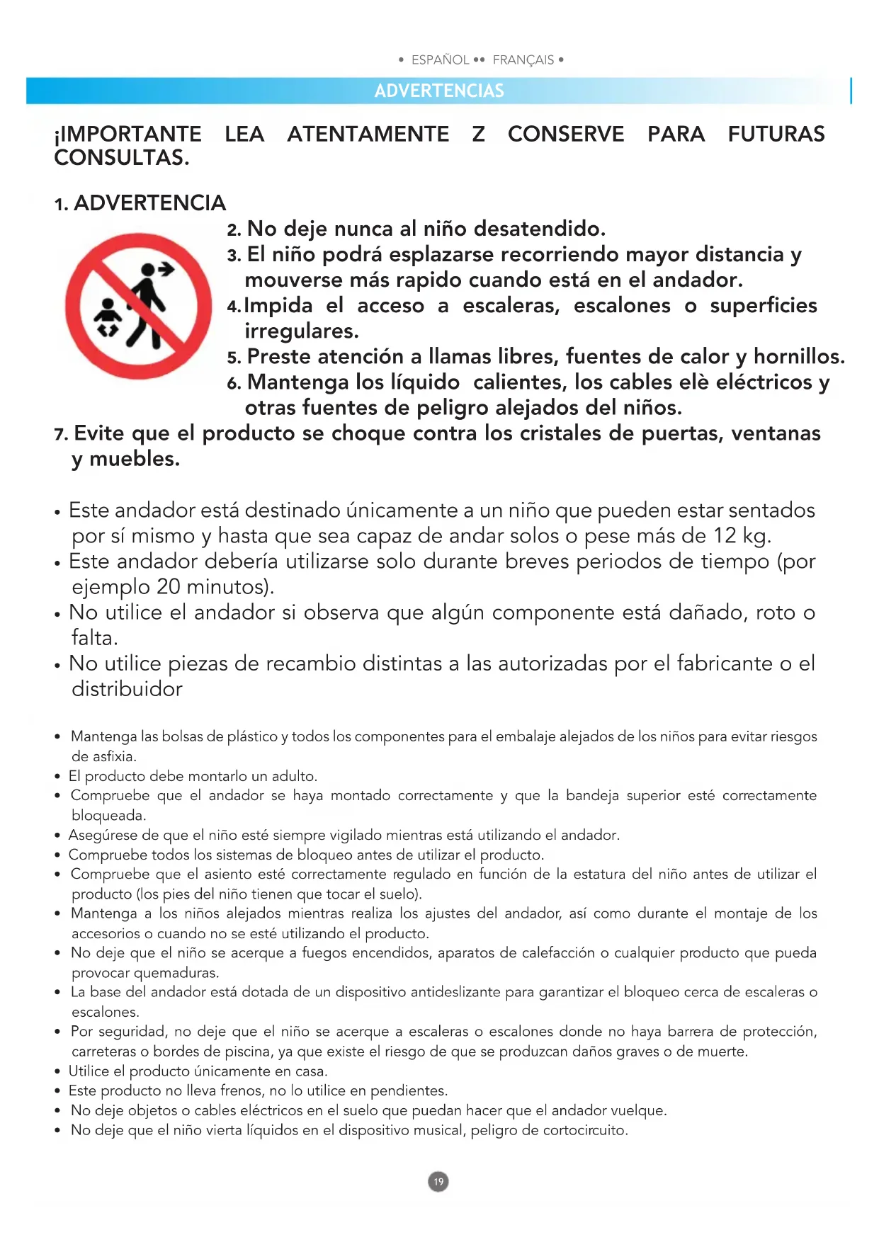 - Asegúrese de que el niño esté siempre vigilado mientras está utilizando el andador.
