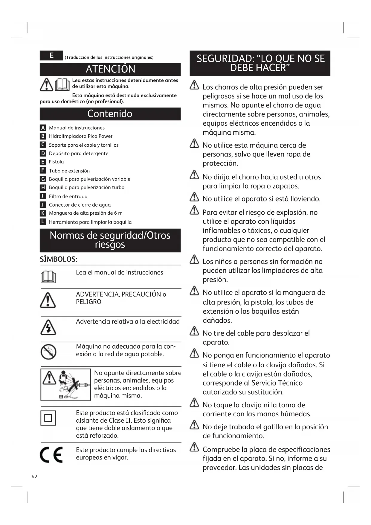 Herramienta para limpiar la boquilla Normas de seguridad/Otros riesgos SÍMBOLOS: Lea el manual de instrucciones ADVERTENCIA, PRECAUCIÓN o PELIGRO Advertencia relativa a la electricidad Máquina no adecuada para la con- exión a la red de agua potable. No apunte directamente sobre personas, animales, equipos eléctricos encendidos o la máquina misma. Este producto está clasificado como aislante de Clase II. Esto significa que tiene doble aislamiento o que está reforzado. Este producto cumple las directivas europeas en vigor.