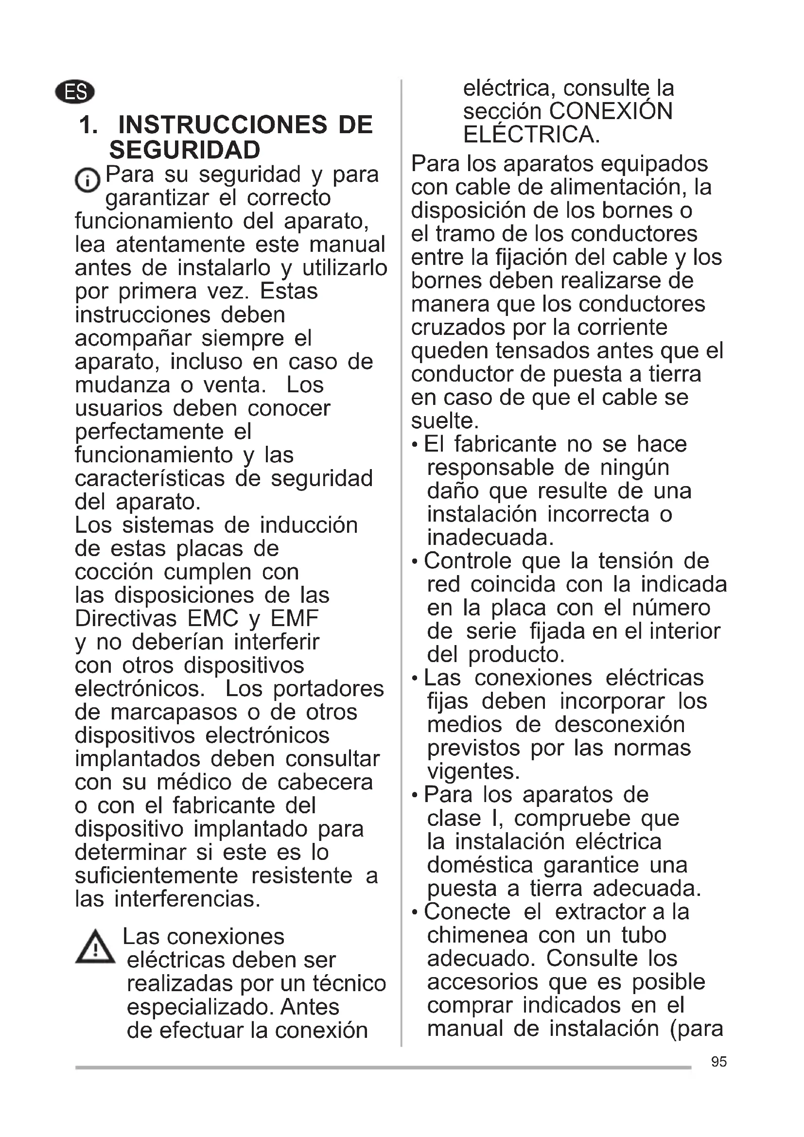 SEGURIDAD Para su seguridad y para garantizar el correcto funcionamiento del aparato, lea atentamente este manual antes de instalarlo y utilizarlo por primera vez. Estas instrucciones deben acompañar siempre el aparato, incluso en caso de mudanza o venta. Los usuarios deben conocer perfectamente el funcionamiento y las características de seguridad del aparato. Los sistemas de inducción de estas placas de cocción cumplen con las disposiciones de las Directivas EMC y EMF y no deberían interferir con otros dispositivos electrónicos. Los portadores de marcapasos o de otros dispositivos electrónicos implantados deben consultar con su médico de cabecera o con el fabricante del dispositivo implantado para determinar si este es lo sucientemente resistente a las interferencias. Las conexiones eléctricas deben ser realizadas por un técnico especializado. Antes de efectuar la conexión eléctrica, consulte la sección CONEXIÓN ELÉCTRICA. Para los aparatos equipados con cable de alimentación, la disposición de los bornes o el tramo de los conductores entre la jación del cable y los bornes deben realizarse de manera que los conductores cruzados por la corriente queden tensados antes que el conductor de puesta a tierra en caso de que el cable se suelte.