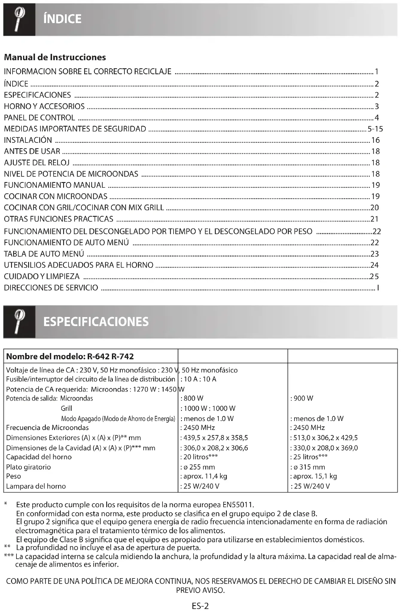 - Este producto cumple con los requisitos de la norma europea EN55011. En conformidad con esta norma, este producto se clasi ca en el grupo equipo 2 de clase B. El grupo 2 signi ca que el equipo genera energía de radio frecuencia intencionadamente en forma de radiación electromagnética para el tratamiento térmico de los alimentos. El equipo de Clase B signi ca que el equipo es apropiado para utilizarse en establecimientos domésticos. ** La profundidad no incluye el asa de apertura de puerta. *** La capacidad interna se calcula midiendo la anchura, la profundidad y la altura máxima. La capacidad real de alma- cenaje de alimentos es inferior. COMO PARTE DE UNA POLÍTICA DE MEJORA CONTINUA, NOS RESERVAMOS EL DERECHO DE CAMBIAR EL DISEÑO SIN PREVIO AVISO. 2ES-3 ESPAÑOL