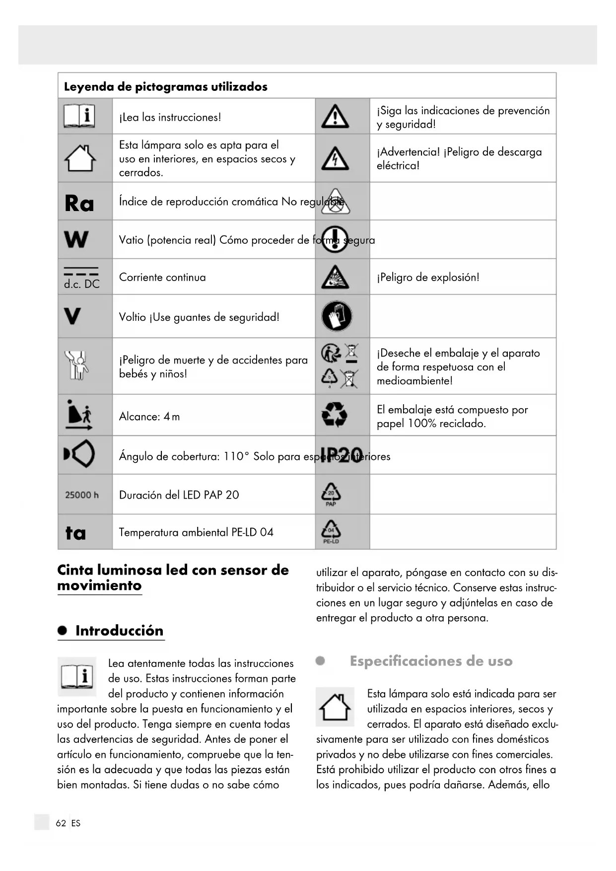 Temperatura ambiental PE-LD 04 Cinta luminosa led con sensor de movimiento Introducción Lea atentamente todas las instrucciones de uso. Estas instrucciones forman parte del producto y contienen información importante sobre la puesta en funcionamiento y el uso del producto. Tenga siempre en cuenta todas las advertencias de seguridad. Antes de poner el artículo en funcionamiento, compruebe que la ten- sión es la adecuada y que todas las piezas están bien montadas. Si tiene dudas o no sabe cómo utilizar el aparato, póngase en contacto con su dis- tribuidor o el servicio técnico. Conserve estas instruc- ciones en un lugar seguro y adjúntelas en caso de entregar el producto a otra persona. Especificaciones de uso Esta lámpara solo está indicada para ser utilizada en espacios interiores, secos y cerrados. El aparato está diseñado exclu- sivamente para ser utilizado con fines domésticos privados y no debe utilizarse con fines comerciales. Está prohibido utilizar el producto con otros fines a los indicados, pues podría dañarse. Además, ello63 ES Introducción / SeguridadIntroducción implicaría otros peligros como cortocircuitos, incen- dios, descargas eléctricas, etc. No utilice esta luz como lamparilla de noche. Este producto ha sido diseñado para un uso normal. Contenido Después de desembalar el aparato, compruebe siempre que se encuentra todo el contenido indi- cado y que el aparato se encuentra en perfecto estado. 1 cinta de luz LED 1 cinta adhesiva 4 pilas, 1,5 V, AAA 1 manual de instrucciones de uso y montaje Descripción de los componentes