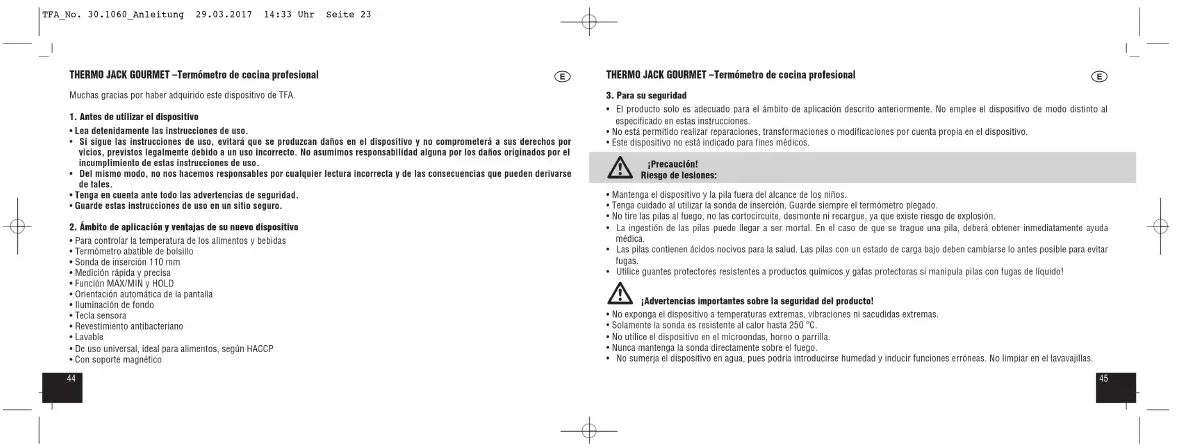 - NOTA: Antes de cambiar la pila el dispositivo debe estar apagado (cierre la sonda de temperatura). TFA_No. 30.1060_Anleitung 29.03.2017 14:33 Uhr Seite 255150 THERMO JACK GOURMET –Termómetro de cocina profesional