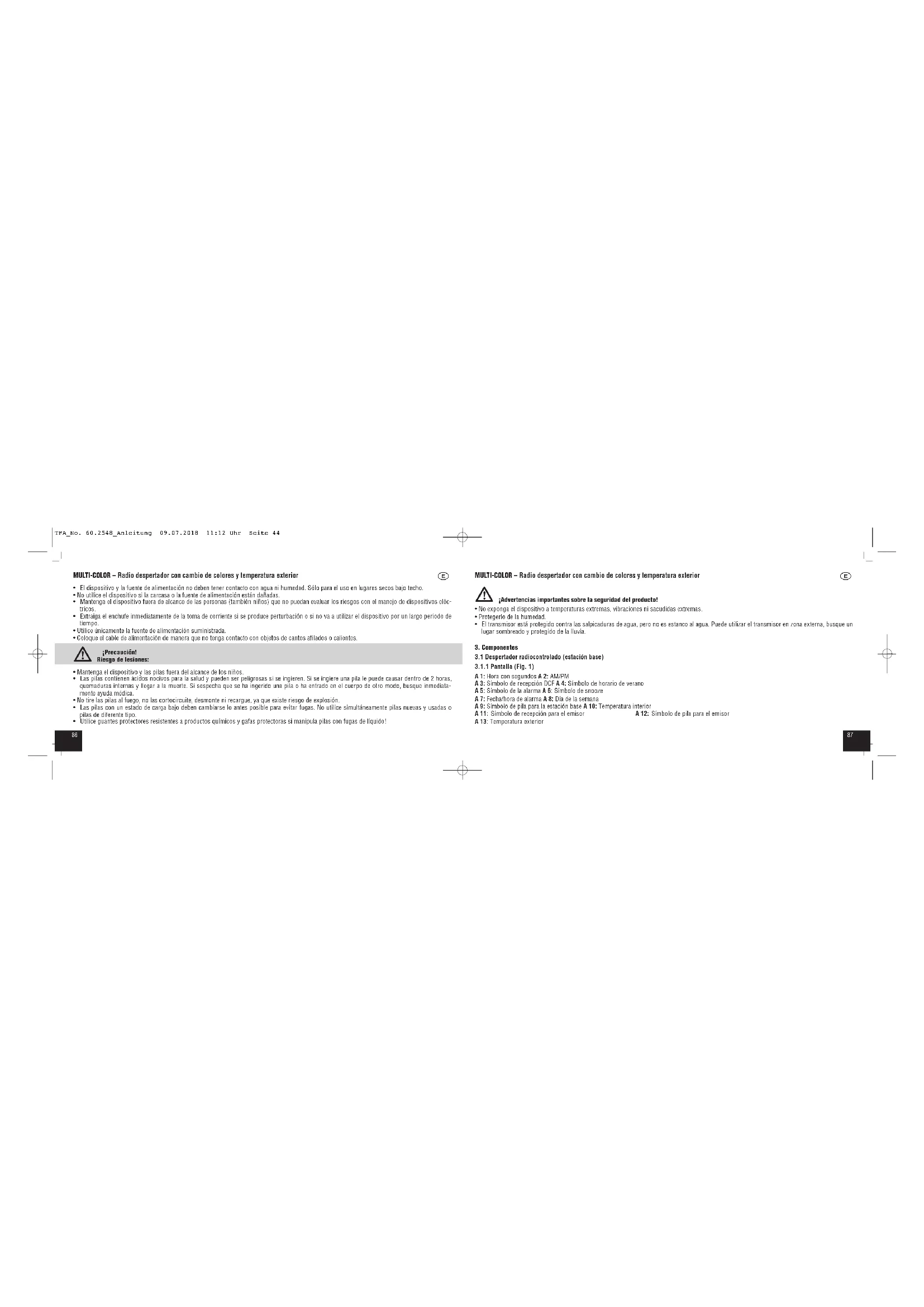 - Utilice guantes protectores resistentes a productos químicos y gafas protectoras si manipula pilas con fugas de líquido! TFA_No. 60.2548_Anleitung 09.07.2018 11:12 Uhr Seite 448988 MULTI-COLOR – Radio despertador con cambio de colores y temperatura exterior