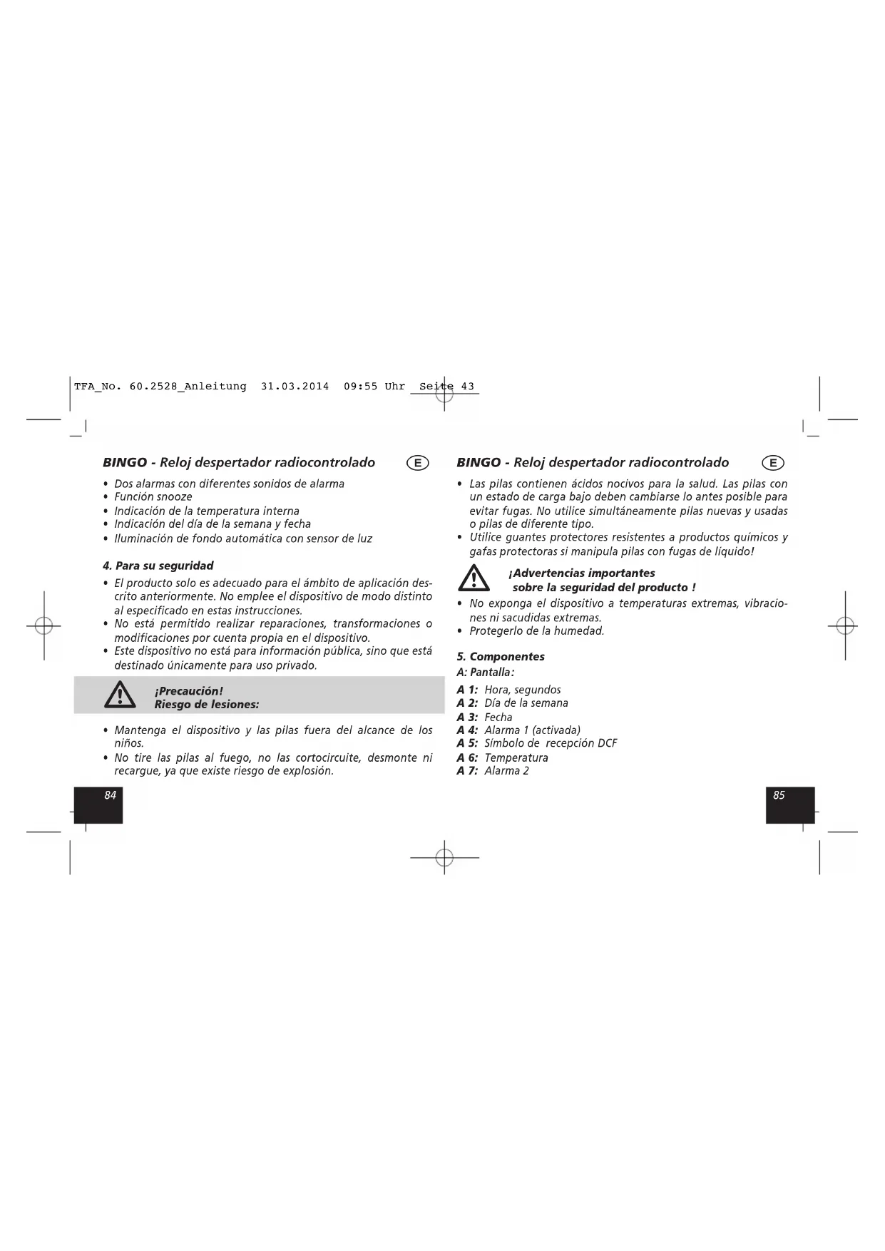 No tire las pilas al fuego, no las cortocircuite, desmonte ni recargue, ya que existe riesgo de explosión. BINGO - Reloj despertador radiocontrolado