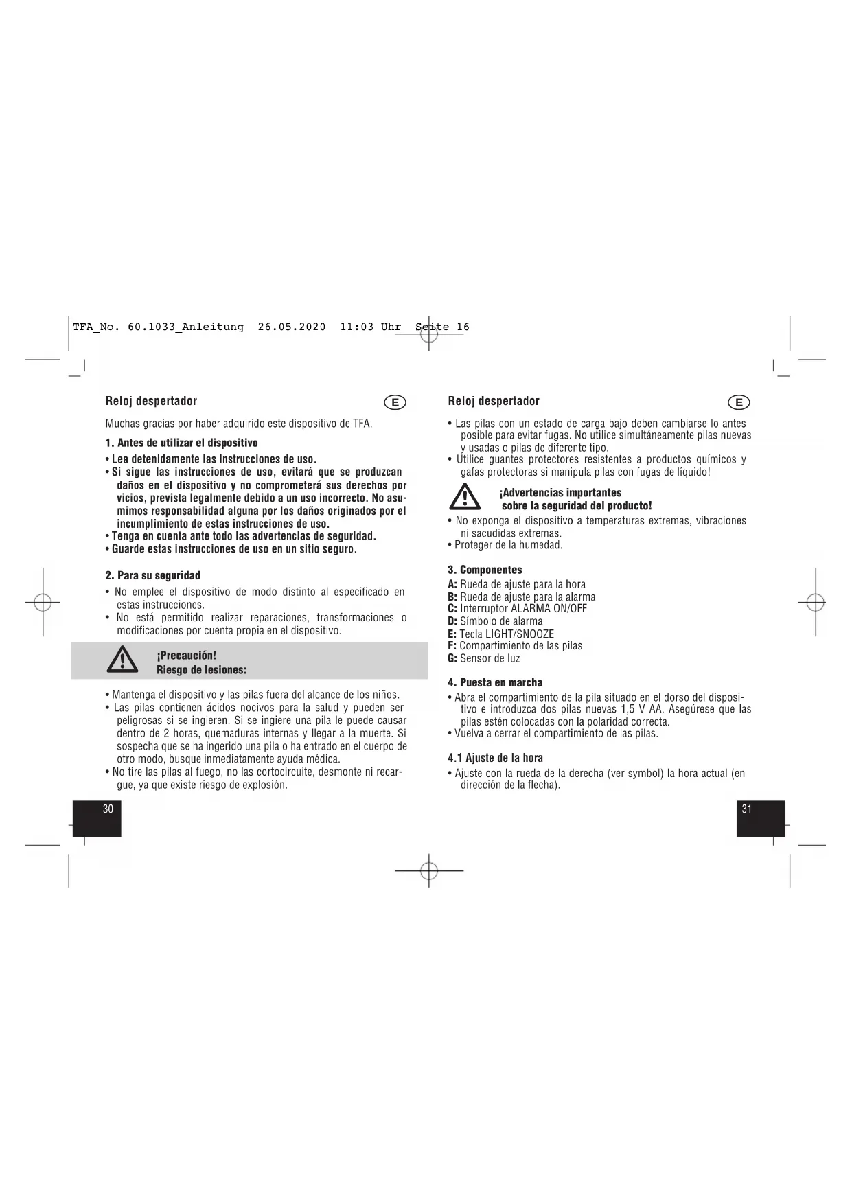 Este producto ha sido fabricado con materiales y componentes de máxima calidad que pueden ser reciclados y reutilizados. Las pilas y baterías no pueden desecharse en ningún caso junto con la basura doméstica. Como consumidor, está obligado legalmente a deposi- tar las pilas y baterías usadas de manera respetuosa con el medio ambiente en el comercio especializado o bien en los centros de recogida y reciclaje previstos para ello según el reglamento nacional o local. Las denominaciones de los metales pesados que con- tienen son: Cd=cadmio, Hg=mercurio, Pb=plomo Este dispositivo está identificado conforme a la Direc- tiva de la UE sobre residuos de aparatos eléctricos y electrónicos (WEEE). TFA_No. 60.1033_Anleitung 26.05.2020 11:03 Uhr Seite 173534 Reloj despertador