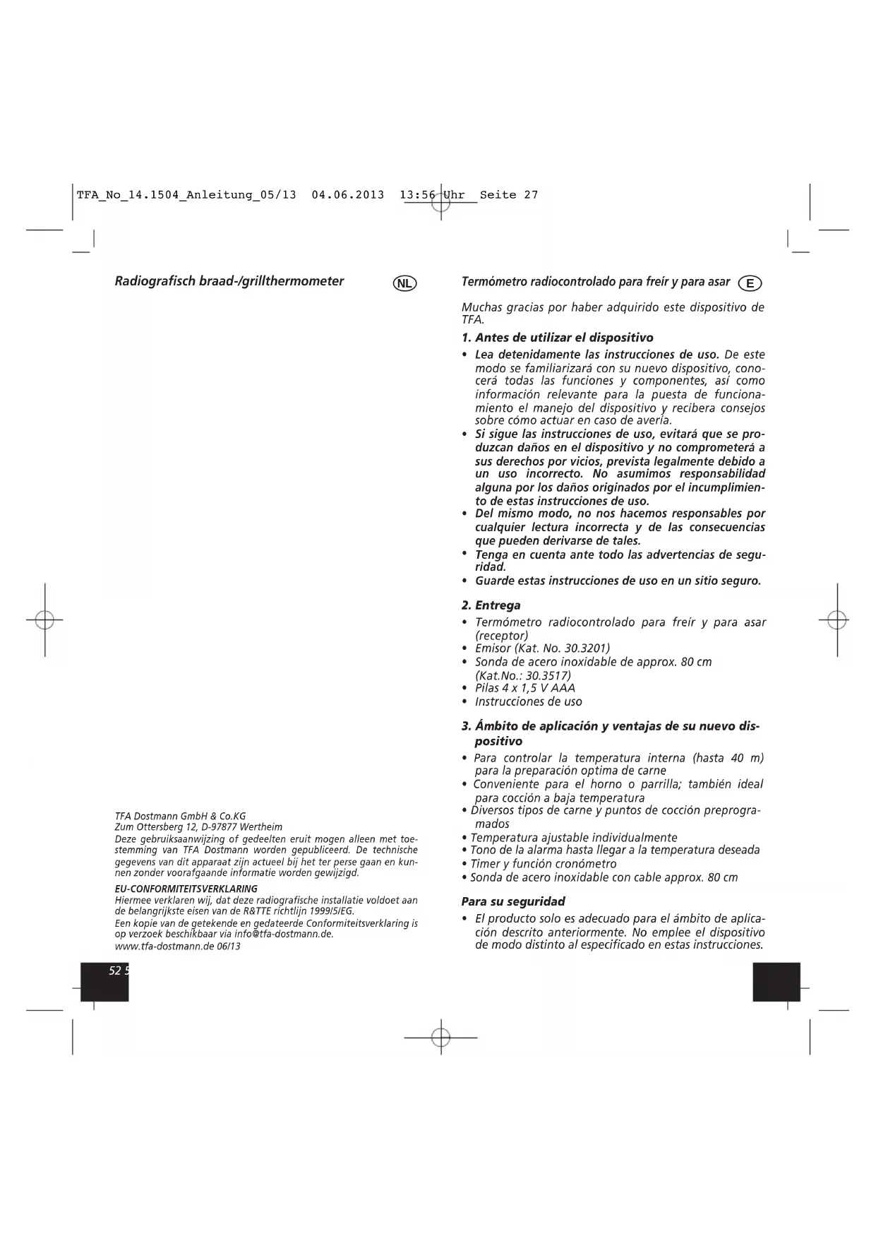 Declaramos que esta instalación de radio cumple con los requisitos fundamentales de la directiva R&TTE 1999/5/CE. Tiene a su disposición una copia firmada y sellada de la Declaración de Conformidad, solicítela al info@tfa-dostmann.de. www.tfa-dostmann.de 06/13 TFA_No_14.1504_Anleitung_05/13 04.06.2013 13:56 Uhr Seite 32