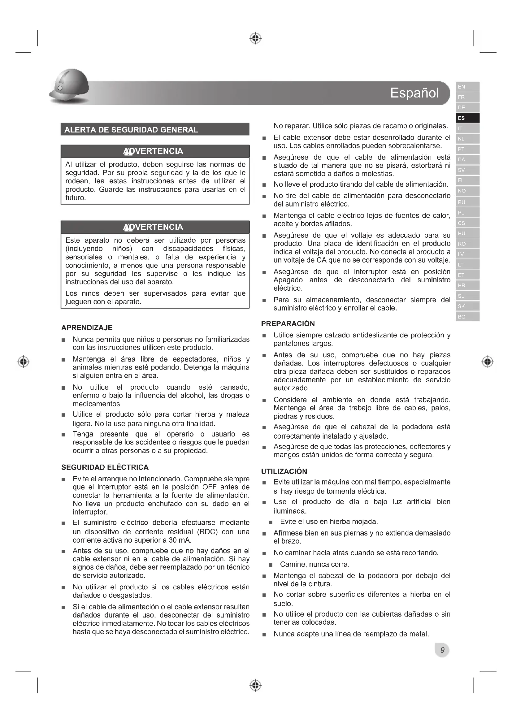 Ŷ Evite el arranque no intencionado. Compruebe siempre que el interruptor está en la posición OFF antes de conectar la herramienta a la fuente de alimentación. No lleve un producto enchufado con su dedo en el interruptor. Ŷ El suministro eléctrico debería efectuarse mediante un dispositivo de corriente residual (RDC) con una corriente activa no superior a 30 mA. Ŷ Antes de su uso, compruebe que no hay daños en el cable extensor ni en el cable de alimentación. Si hay signos de daños, debe ser reemplazado por un técnico de servicio autorizado. Ŷ No utilizar el producto si los cables eléctricos están dañados o desgastados. Ŷ Si el cable de alimentación o el cable extensor resultan dañados durante el uso, desconectar del suministro eléctrico inmediatamente. No tocar los cables eléctricos hasta que se haya desconectado el suministro eléctrico. No reparar. Utilice sólo piezas de recambio originales. Ŷ El cable extensor debe estar desenrollado durante el uso. Los cables enrollados pueden sobrecalentarse. Ŷ Asegúrese de que el cable de alimentación está situado de tal manera que no se pisará, estorbará ni estará sometido a daños o molestias. Ŷ No lleve el producto tirando del cable de alimentación. Ŷ No tire del cable de alimentación para desconectarlo del suministro eléctrico. Ŷ Mantenga el cable eléctrico lejos de fuentes de calor, aceite y bordes afilados. Ŷ Asegúrese de que el voltaje es adecuado para su producto. Una placa de identificación en el producto indica el voltaje del producto. No conecte el producto a un voltaje de CA que no se corresponda con su voltaje. Ŷ Asegúrese de que el interruptor está en posición Apagado antes de desconectarlo del suministro eléctrico. Ŷ Para su almacenamiento, desconectar siempre del suministro eléctrico y enrollar el cable. PREPARACIÓN Ŷ Utilice siempre calzado antideslizante de protección y pantalones largos. Ŷ Antes de su uso, compruebe que no hay piezas dañadas. Los interruptores defectuosos o cualquier otra pieza dañada deben ser sustituidos o reparados adecuadamente por un establecimiento de servicio autorizado. Ŷ Considere el ambiente en donde está trabajando. Mantenga el área de trabajo libre de cables, palos, piedras y residuos. Ŷ Asegúrese de que el cabezal de la podadora está correctamente instalado y ajustado. Ŷ Asegúrese de que todas las protecciones, deflectores y mangos están unidos de forma correcta y segura. UTILIZACIÓN Ŷ Evite utilizar la máquina con mal tiempo, especialmente si hay riesgo de tormenta eléctrica. Ŷ Use el producto de día o bajo luz artificial bien iluminada. Ŷ Evite el uso en hierba mojada. Ŷ Afírmese bien en sus piernas y no extienda demasiado el brazo. Ŷ No caminar hacia atrás cuando se está recortando. Ŷ Camine, nunca corra. Ŷ Mantenga el cabezal de la podadora por debajo del nivel de la cintura. Ŷ No cortar sobre superficies diferentes a hierba en el suelo. Ŷ No utilice el producto con las cubiertas dañadas o sin tenerlas colocadas. Ŷ Nunca adapte una línea de reemplazo de metal.Español