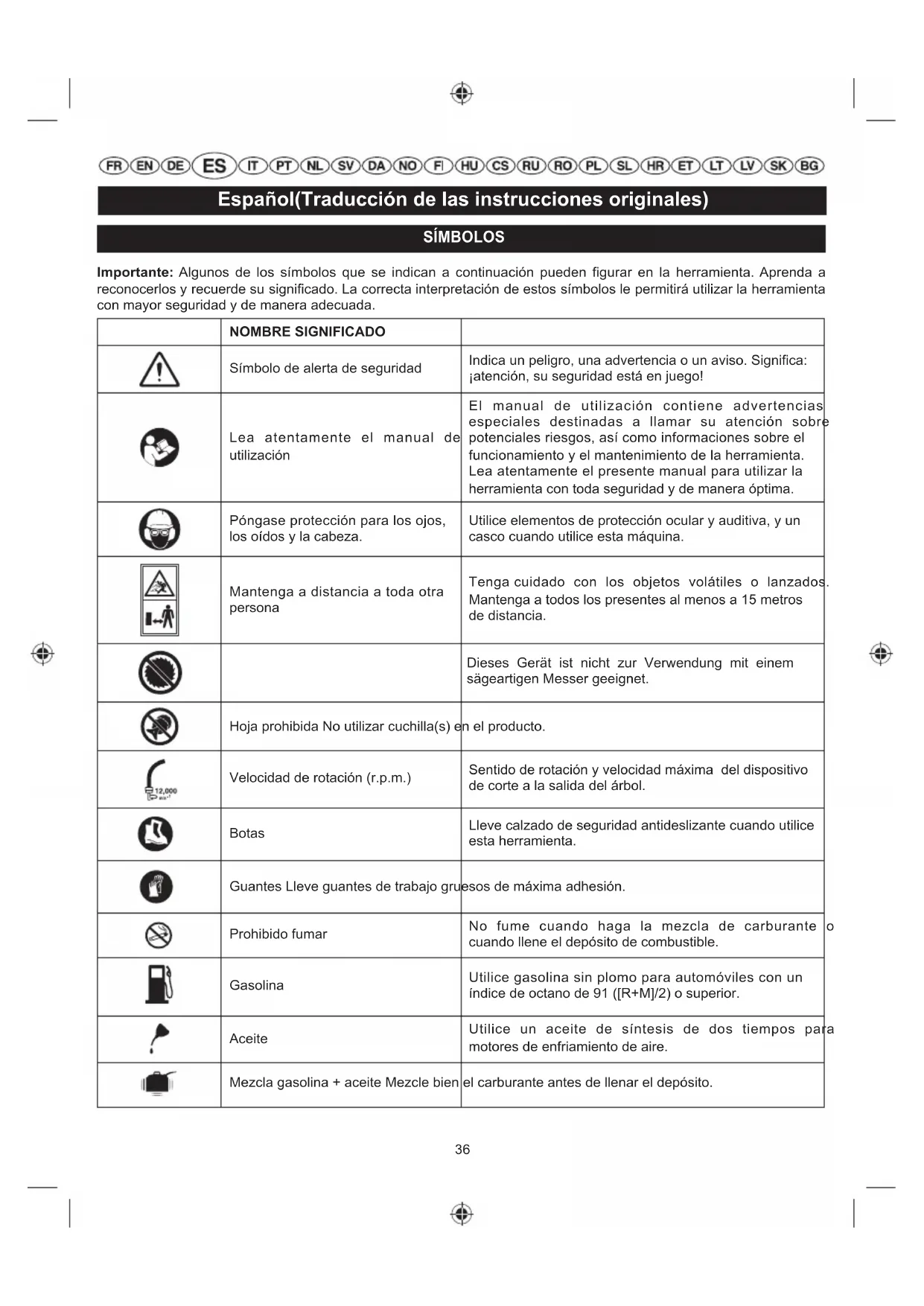 Informationen im Abschnitt "Austausch und Reinigung des Luftfilters".36 Español(Traducción de las instrucciones originales) SÍMBOLOS Importante: Algunos de los símbolos que se indican a continuación pueden figurar en la herramienta. Aprenda a reconocerlos y recuerde su significado. La correcta interpretación de estos símbolos le permitirá utilizar la herramienta con mayor seguridad y de manera adecuada. NOMBRE SIGNIFICADO Símbolo de alerta de seguridad Indica un peligro, una advertencia o un aviso. Significa: ¡atención, su seguridad está en juego! Lea atentamente el manual de utilización El manual de utilización contiene advertencias especiales destinadas a llamar su atención sobre potenciales riesgos, así como informaciones sobre el funcionamiento y el mantenimiento de la herramienta. Lea atentamente el presente manual para utilizar la herramienta con toda seguridad y de manera óptima. Póngase protección para los ojos, los oídos y la cabeza. Utilice elementos de protección ocular y auditiva, y un casco cuando utilice esta máquina. Mantenga a distancia a toda otra persona Tenga cuidado con los objetos volátiles o lanzados. Mantenga a todos los presentes al menos a 15 metros de distancia. Dieses Gerät ist nicht zur Verwendung mit einem sägeartigen Messer geeignet. Hoja prohibida No utilizar cuchilla(s) en el producto. Velocidad de rotación (r.p.m.) Sentido de rotación y velocidad máxima del dispositivo de corte a la salida del árbol. Botas Lleve calzado de seguridad antideslizante cuando utilice esta herramienta. Guantes Lleve guantes de trabajo gruesos de máxima adhesión. Prohibido fumar No fume cuando haga la mezcla de carburante o cuando llene el depósito de combustible. Gasolina Utilice gasolina sin plomo para automóviles con un índice de octano de 91 ([R+M]/2) o superior. Aceite Utilice un aceite de síntesis de dos tiempos para motores de enfriamiento de aire. Mezcla gasolina + aceite Mezcle bien el carburante antes de llenar el depósito.37 Español(Traducción de las instrucciones originales) Interruptor Interruptor Marcha/Parada I = marcha O = parada Mantenga las manos alejadas de las hojas. Posición de funcionamiento Coloque la palanca del estrangulador en posición “FULL”. Coloque la palanca del estrangulador en la posición “HALF”. Ponga el interruptor de encendido en la posición “I” (ENCENDIDO). Pulse el cebador 10 veces. Tire de la manija de arranque para arrancar el motor. Deslice el bloqueo del acelerador y el gatillo del acelerador para arrancar el motor. Tiempo de espera 10 segundos Para parar el motor, desplace el interruptor de encendido a la posición “O” de parada . Esta herramienta responde a todas las normas reglamentarias del país de la UE donde ha sido comprada. EurAsian Conformity Mark Marca de conformidad ucraniana Los siguientes símbolos y palabras detallan los niveles de cuidado necesarios para usar este producto.