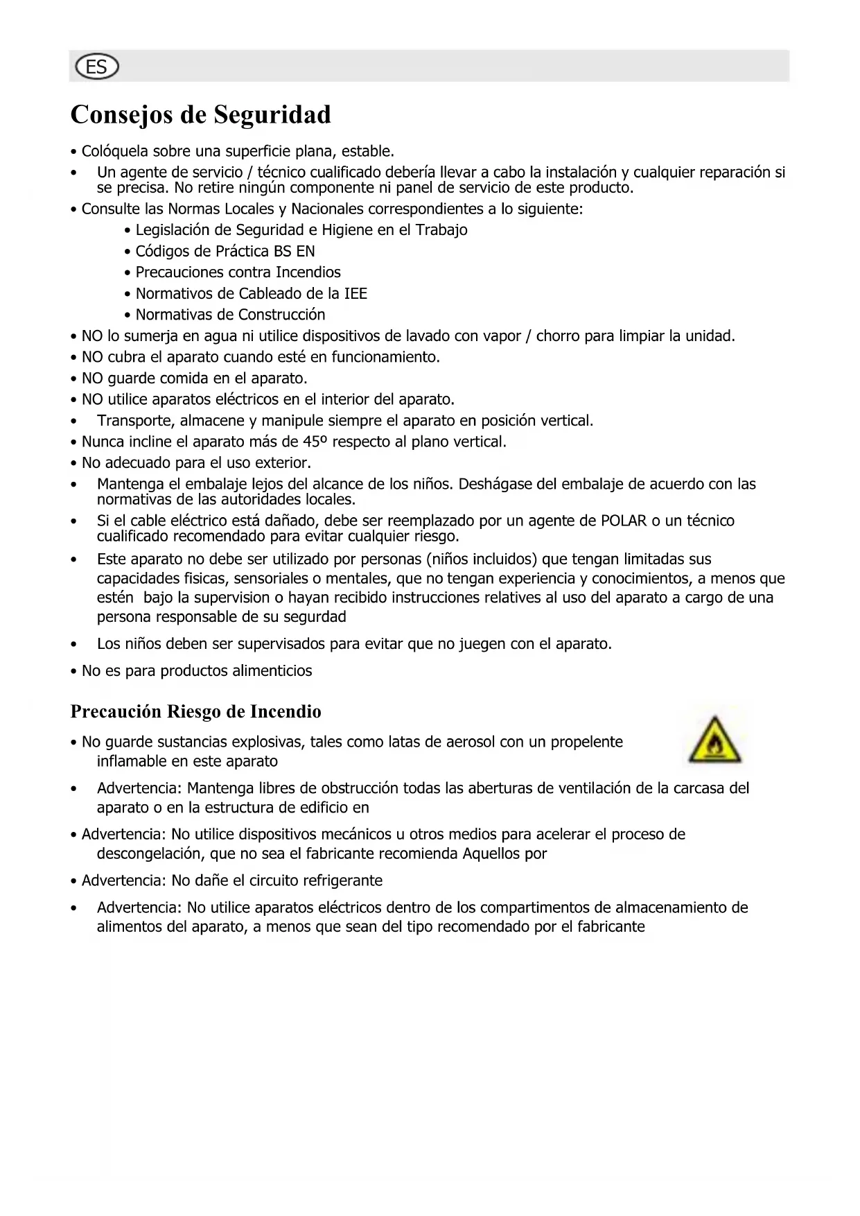 - Advertencia: No utilice aparatos eléctricos dentro de los compartimentos de almacenamiento de alimentos del aparato, a menos que sean del tipo recomendado por el fabricanteES Línea de asistencia telefónica : 901-100 133 (España) Descripción del Producto Introducción Tómese unos minutos para leer este manual. El correcto mantenimiento y manejo de esta máquina proporcionará el mejor funcionamiento posible de su producto POLAR. Contenido del Conjunto Se incluye lo siguiente: POLAR se enorgullece de su calidad y servicio y asegura que en el momento del embalaje, el contenido se suministró con plena funcionalidad y sin ningún defecto. Si encontrara algún daño resultante del transporte, póngase en contacto inmediatamente con su distribuidor POLAR.