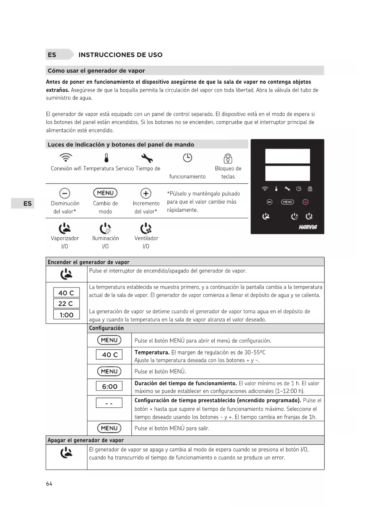 Configuración de tiempo preestablecido (encendido programado). Pulse el botón + hasta que supere el tiempo de funcionamiento máximo. Seleccione el tiempo deseado usando los botones - y +. El tiempo cambia en franjas de 1h. Pulse el botón MENÚ para salir. Apagar el generador de vapor El generador de vapor se apaga y cambia al modo de espera cuando se presiona el botón I/O, cuando ha transcurrido el tiempo de funcionamiento o cuando se produce un error.ES