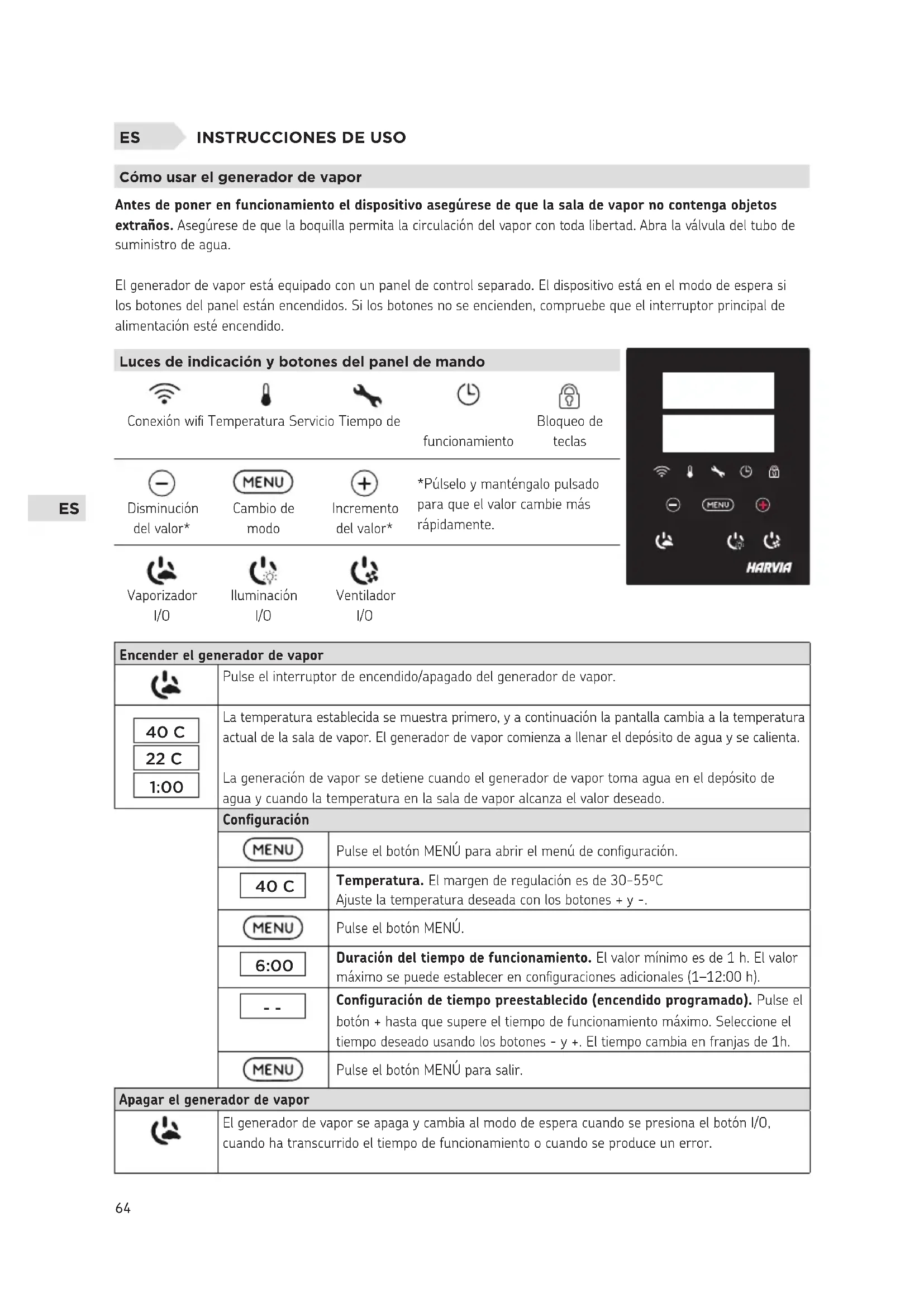 Cómo usar el generador de vapor Antes de poner en funcionamiento el dispositivo asegúrese de que la sala de vapor no contenga objetos extraños. Asegúrese de que la boquilla permita la circulación del vapor con toda libertad. Abra la válvula del tubo de suministro de agua. El generador de vapor está equipado con un panel de control separado. El dispositivo está en el modo de espera si los botones del panel están encendidos. Si los botones no se encienden, compruebe que el interruptor principal de alimentación esté encendido. Luces de indicación y botones del panel de mando Conexión wifi Temperatura Servicio Tiempo de funcionamiento Bloqueo de teclas *Púlselo y manténgalo pulsado para que el valor cambie más rápidamente. Disminución del valor* Cambio de modo Incremento del valor* Vaporizador I/O Iluminación I/O Ventilador I/O Encender el generador de vapor Pulse el interruptor de encendido/apagado del generador de vapor. 40 C 22 C 1:00 La temperatura establecida se muestra primero, y a continuación la pantalla cambia a la temperatura actual de la sala de vapor. El generador de vapor comienza a llenar el depósito de agua y se calienta. La generación de vapor se detiene cuando el generador de vapor toma agua en el depósito de agua y cuando la temperatura en la sala de vapor alcanza el valor deseado. Configuración Pulse el botón MENÚ para abrir el menú de configuración. 40 C Temperatura. El margen de regulación es de 30-55ºC Ajuste la temperatura deseada con los botones + y -. Pulse el botón MENÚ. 6:00 Duración del tiempo de funcionamiento. El valor mínimo es de 1 h. El valor máximo se puede establecer en configuraciones adicionales (1–12:00 h).