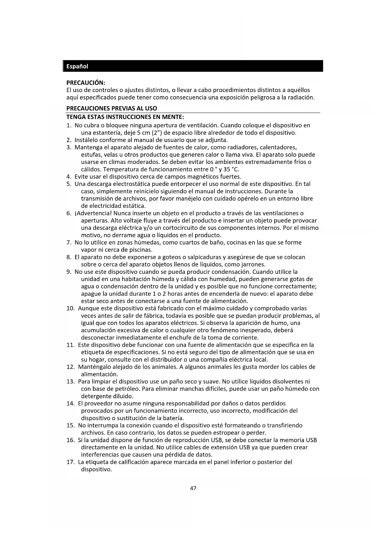 22. Nunca coloque este dispositivo sobre otro equipo eléctrico.