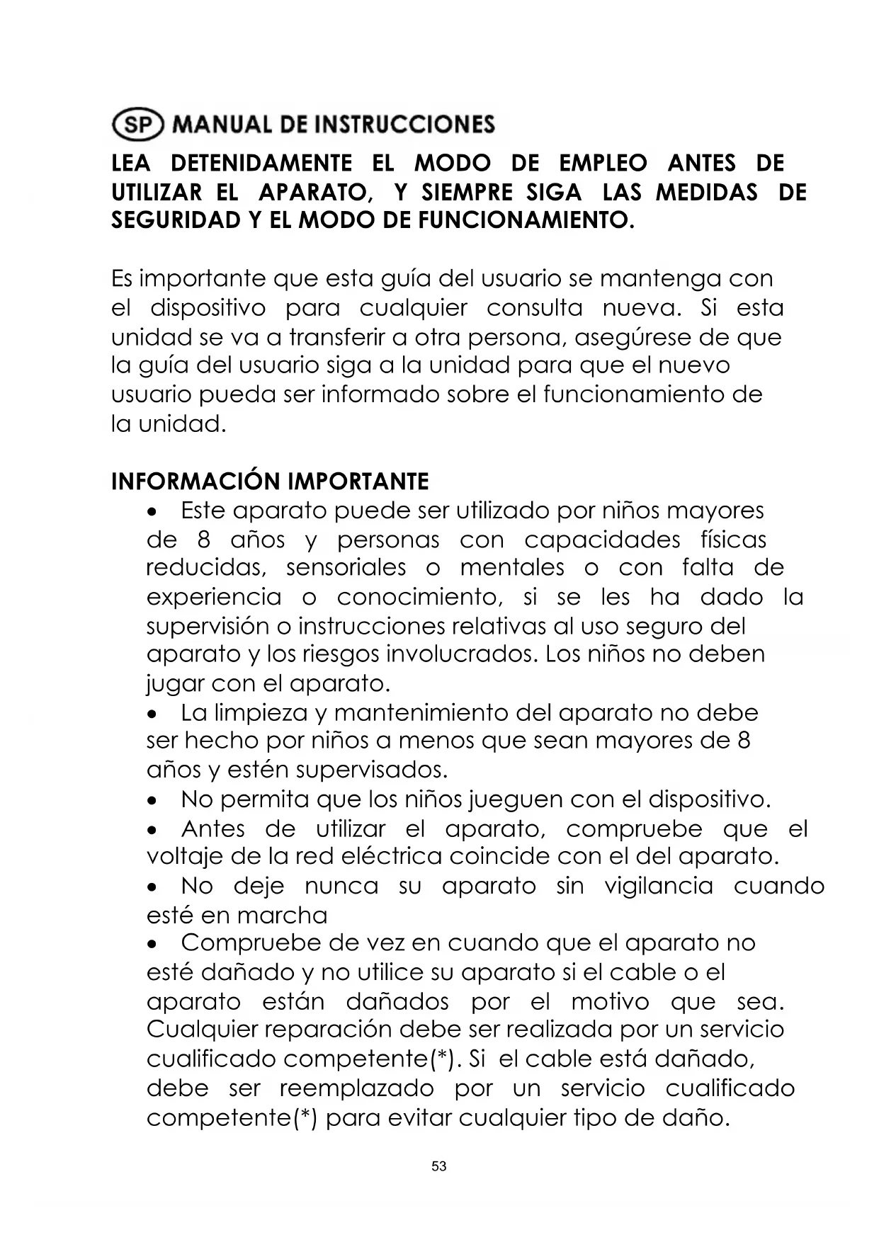 Este aparato puede ser utilizado por niños mayores de 8 años y personas con capacidades físicas reducidas, sensoriales o mentales o con falta de experiencia o conocimiento, si se les ha dado la supervisión o instrucciones relativas al uso seguro del aparato y los riesgos involucrados. Los niños no deben jugar con el aparato. La limpieza y mantenimiento del aparato no debe ser hecho por niños a menos que sean mayores de 8 años y estén supervisados. No permita que los niños jueguen con el dispositivo. Antes de utilizar el aparato, compruebe que el voltaje de la red eléctrica coincide con el del aparato. No deje nunca su aparato sin vigilancia cuando esté en marcha Compruebe de vez en cuando que el aparato no esté dañado y no utilice su aparato si el cable o el aparato están dañados por el motivo que sea. Cualquier reparación debe ser realizada por un servicio cualificado competente(*). Si el cable está dañado, debe ser reemplazado por un servicio cualificado competente(*) para evitar cualquier tipo de daño.