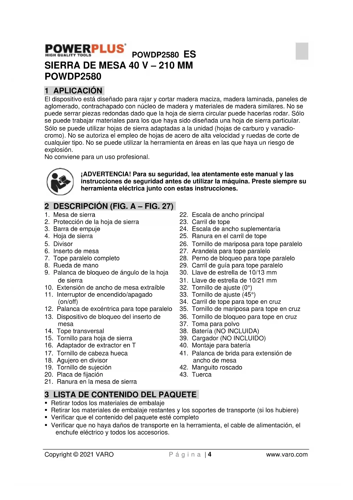 VARO N.V. – Vic. Van Rompuy N.V. Joseph Van Instraat 9. BE2500 Lier – Bélgica, declara que: Tipo de aparato: Sierra de mesa – Funciona con batería Marca: PowerPlus Número del producto: POWDP2580 está en conformidad con los requisitos esenciales y otras disposiciones pertinentes de las Directivas europeas aplicables, basados en la aplicación de las normas europeas armonizadas. Cualquier modificación no autorizada de este aparato anula esta declaración. Directivas europeas (incluyendo, si se aplica, sus respectivas enmiendas hasta la fecha de la firma): 2011/65/EU 2014/30/EC 2006/42/EC Normas europeas armonizadas (incluyendo, si se aplica, sus respectivas hasta la fecha de la firma): EN62841-1 : 2015 EN62841-3-1 : 2014 EN55014-1 : 2017 EN55014-2 : 2015 Custodio de la documentación técnica: Philippe Vankerkhove, VARO – Vic. Van Rompuy N.V. El suscrito actúa en nombre del director general de la compañía, Ludo Mertens Asuntos reglamentarios - Director de conformidad 28/10/2021, Lier - BelgiumPOWDP2580 IT Copyright © 2021 VARO Pag. | 1 www.varo.com 1 APPLICAZIONE ............................................................................... 4