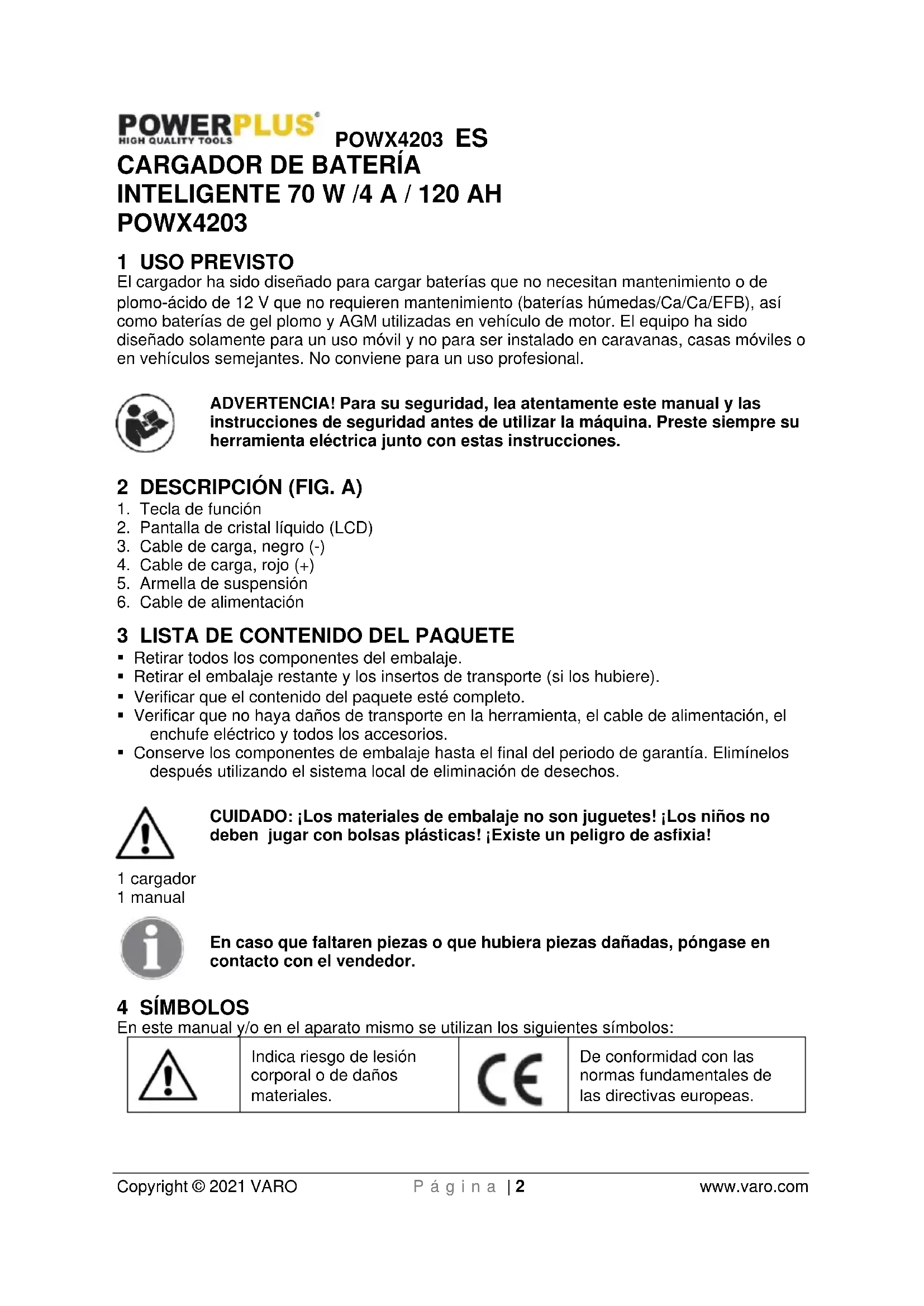 VARO-Vic. Van Rompuy N.V. – Joseph Van Instraat 9. BE2500 Lier – Bélgica, declara que: Tipo de aparato: Cargador inteligente Marca: POWERplus Número del producto: POWX4203 está en conformidad con los requisitos esenciales y otras disposiciones pertinentes de las Directivas europeas aplicables, basados en la aplicación de las normas europeas armonizadas. Cualquier modificación no autorizada de este aparato anula esta declaración. Directivas europeas (incluyendo, si se aplica, sus respectivas enmiendas hasta la fecha de la firma): 2011/65/EU 2014/30/EU 2014/35/EU Normas europeas armonizadas (incluyendo, si se aplica, sus respectivas hasta la fecha de la firma): EN60335-1 : 2012 EN60335-2-29 : 2004 EN55014-1 : 2017 EN55014-2 : 2015 EN61000-3-2 : 2014 EN61000-3-3 : 2013 Custodio de la documentación técnica: Philippe Vankerkhove, VARO – Vic. Van Rompuy N.V. El suscrito actúa en nombre del director general de la compañía, Philippe Vankerkhove Asuntos reglamentarios - Director de conformidad Lier, 27/11/2020POWX4203 IT Copyright © 2021 VARO Pagina | 1 www.varo.com 1 USO PREVISTO .............................................................................. 2