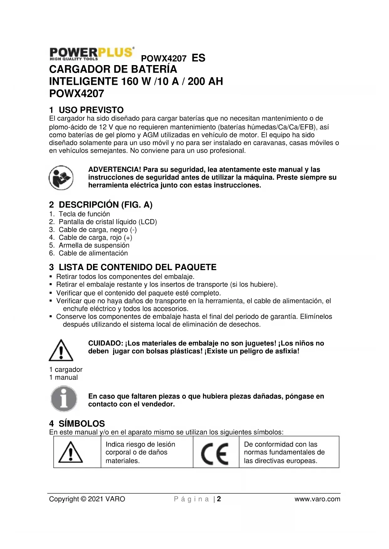 VARO-Vic. Van Rompuy N.V. – Joseph Van Instraat 9. BE2500 Lier – Bélgica, declara que: Tipo de aparato: Cargador inteligente Marca: POWERplus Número del producto: POWX4207 está en conformidad con los requisitos esenciales y otras disposiciones pertinentes de las Directivas europeas aplicables, basados en la aplicación de las normas europeas armonizadas. Cualquier modificación no autorizada de este aparato anula esta declaración. Directivas europeas (incluyendo, si se aplica, sus respectivas enmiendas hasta la fecha de la firma): 2011/65/EU 2014/30/EU 2014/35/EU Normas europeas armonizadas (incluyendo, si se aplica, sus respectivas hasta la fecha de la firma): EN60335-1 : 2012 EN60335-2-29 : 2004 EN55014-1 : 2017 EN55014-2 : 2015 EN61000-3-2 : 2014 EN61000-3-3 : 2013 Custodio de la documentación técnica: Philippe Vankerkhove, VARO – Vic. Van Rompuy N.V. El suscrito actúa en nombre del director general de la compañía, Philippe Vankerkhove Asuntos reglamentarios - Director de conformidad Lier, 27/11/2020POWX4207 IT Copyright © 2021 VARO Pagina | 1 www.varo.com 1 USO PREVISTO .............................................................................. 2