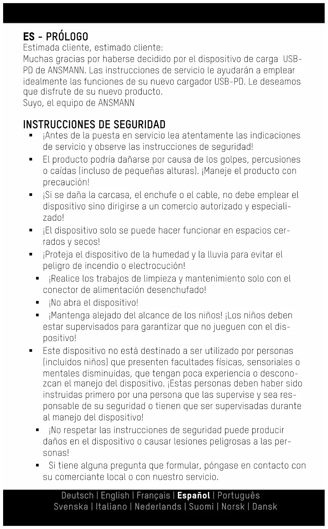 Las informaciones contenidas en este manual de instrucciones se pueden modificar sin aviso previo. ANSMANN no acepta ninguna responsabilidad por los daños directos, indirectos, casuales o de otro tipo, ni por los daños resultantes que se originen por una manipula- ción inapropiada o por no tener en cuenta las informaciones conteni- das en estas instrucciones de uso. INDICACIÓN RELATIVA A LA GARANTÍA El dispositivo cuenta con una garantía de tres años. En caso de daños en el dispositivo que se originen por no respetar las instrucciones de uso no se podrá hacer efectiva ninguna garantía. Reservado el derecho a introducir cambios técnicos. No aceptamos ninguna responsabilidad por errores de impresión. 06/2019 Nuestras disposiciones de garantía se pueden consultar en línea en www.ansmann.dePT - PREFÁCIO Caro(a) cliente, obrigado pela aquisição de um carregador USB-PD ANSMANN. As instruções de operação ajudam-no a aproveitar ao máximo as funções do seu novo carregador USB-PD. Esperamos que goste de utilizar o seu novo produto. A sua equipa ANSMANN