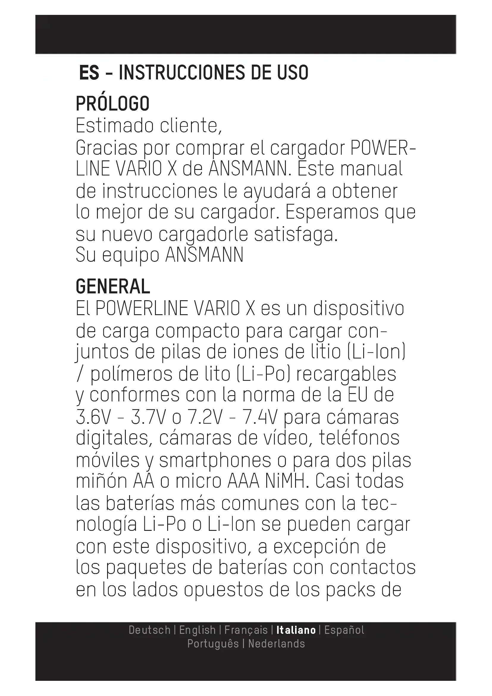 PRÓLOGO Estimado cliente, Gracias por comprar el cargador POWER- LINE VARIO X de ANSMANN. Este manual de instrucciones le ayudará a obtener lo mejor de su cargador. Esperamos que su nuevo cargadorle satisfaga. Su equipo ANSMANN GENERAL El POWERLINE VARIO X es un dispositivo de carga compacto para cargar con- juntos de pilas de iones de litio (Li-Ion) / polímeros de lito (Li-Po) recargables y conformes con la norma de la EU de 3.6V - 3.7V o 7.2V - 7.4V para cámaras digitales, cámaras de vídeo, teléfonos móviles y smartphones o para dos pilas miñón AA o micro AAA NiMH. Casi todas las baterías más comunes con la tec- nología Li-Po o Li-Ion se pueden cargar con este dispositivo, a excepción de los paquetes de baterías con contactos en los lados opuestos de los packs de Deutsch | English | Français | Italiano | Español Português | Nederlandsalojamiento de la batería y la batería cuyos contactos están muy adentro de la carcasa. Un microprocesador supervisa automáticamente el proceso de carga. Para un rendimiento óptimo, recomendamos el uso de pilas recar- gables ANSMANN.