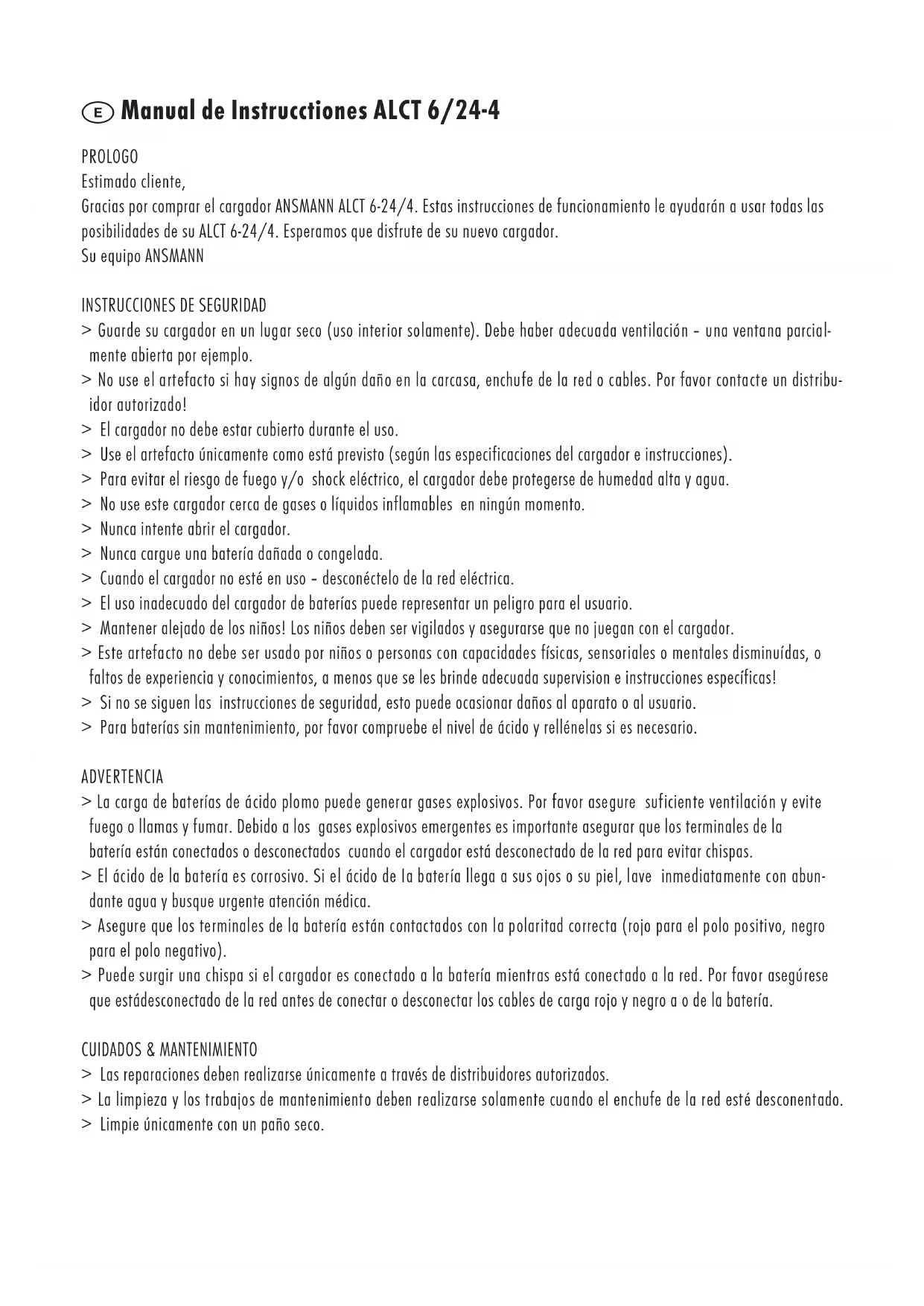 > Guarde su cargador en un lugar seco (uso interior solamente). Debe haber adecuada ventilación – una ventana parcial- mente abierta por ejemplo. > No use el artefacto si hay signos de algún daño en la carcasa, enchufe de la red o cables. Por favor contacte un distribu- idor autorizado! > El cargador no debe estar cubierto durante el uso. > Use el artefacto únicamente como está previsto (según las especificaciones del cargador e instrucciones). > Para evitar el riesgo de fuego y/o shock eléctrico, el cargador debe protegerse de humedad alta y agua. > No use este cargador cerca de gases o líquidos inflamables en ningún momento. > Nunca intente abrir el cargador. > Nunca cargue una batería dañada o congelada. > Cuando el cargador no esté en uso – desconéctelo de la red eléctrica. > El uso inadecuado del cargador de baterías puede representar un peligro para el usuario. > Mantener alejado de los niños! Los niños deben ser vigilados y asegurarse que no juegan con el cargador. > Este artefacto no debe ser usado por niños o personas con capacidades físicas, sensoriales o mentales disminuídas, o faltos de experiencia y conocimientos, a menos que se les brinde adecuada supervision e instrucciones específicas! > Si no se siguen las instrucciones de seguridad, esto puede ocasionar daños al aparato o al usuario. > Para baterías sin mantenimiento, por favor compruebe el nivel de ácido y rellénelas si es necesario. ADVERTENCIA > La carga de baterías de ácido plomo puede generar gases explosivos. Por favor asegure suficiente ventilación y evite fuego o llamas y fumar. Debido a los gases explosivos emergentes es importante asegurar que los terminales de la batería están conectados o desconectados cuando el cargador está desconectado de la red para evitar chispas. > El ácido de la batería es corrosivo. Si el ácido de Ia batería llega a sus ojos o su piel, lave inmediatamente con abun- dante agua y busque urgente atención médica. > Asegure que los terminales de la batería están contactados con la polaritad correcta (rojo para el polo positivo, negro para el polo negativo). > Puede surgir una chispa si el cargador es conectado a la batería mientras está conectado a la red. Por favor asegúrese que estádesconectado de la red antes de conectar o desconectar los cables de carga rojo y negro a o de la batería. CUIDADOS & MANTENIMIENTO > Las reparaciones deben realizarse únicamente a través de distribuidores autorizados. > La limpieza y los trabajos de mantenimiento deben realizarse solamente cuando el enchufe de la red esté desconentado. > Limpie únicamente con un paño seco.FUNCIONES > Cargador automático para baterías de ácido plomo 6V/12V/24V. > Corriente de carga ajustable (1A/2A/4A) dependiendo de la tensión nominal de la batería. > Protección por sobrecarga. > Protección contra corto-circuito y polaridad equivocada. > Inicio de recarga automático. > Modo „ACTUALIZACIÓN“ automático. > Modo „TEMP. FRÍA“ seleccionable.