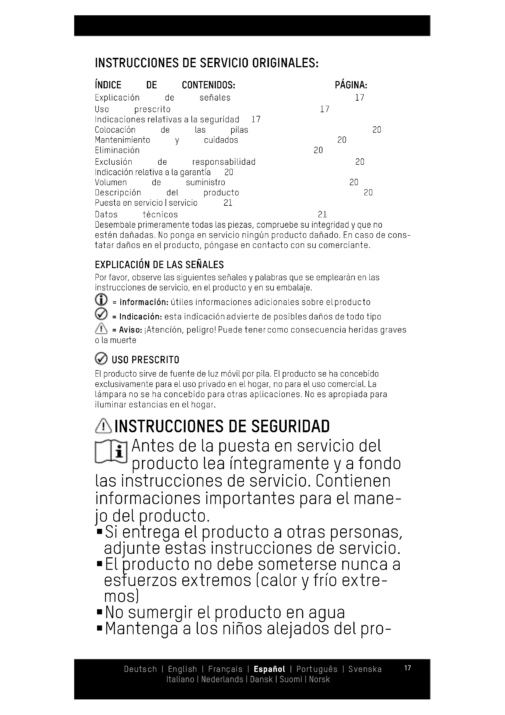Atención: §Este producto contiene pilas. No arroje el producto nunca al fuego19 Deutsch | English | Français | Español | Português | Svenska Italiano | Nederlands | Dansk | Suomi | Norsk §Las pilas incorrectamente colocadas pueden tener fugas y/o causar incen- dios/explosiones §Substituya siempre el juego completo de pilas; emplee siempre pilas equivalentes §Mantenga las pilas alejadas de los niños: peligro de ingestión o asfixia §No intente nunca abrir una pila, aplas- tarla, calentarla o quemarla §No emplee las pilas si el producto pre- sentase daños §Las pilas no son recargables §Elimine las pilas o acumuladores ago- tados siempre observando las leyes y exigencias locales. §En caso de que las pilas tengan fugas de líquido, no las toque. En caso de que, no obstante lo dicho, entre en contacto con el líquido de las pilas, enjuague con agua inmediatamente y a fondo la zona afectada §En caso de que el líquido de las pilas cause una reacción dérmica o entre en los ojos, póngase inmediatamente en contacto con un médico §¡No cortocircuitar las pilas! §El empleo de acumuladores y de pilas aptas para la alta corriente no está permitido por causa de otros valores eléctricos. §Las pilas usadas o agotadas deben reti- rarse de la linterna inmediatamente §En caso de no poder seguir usando la lámpara, deben retirarle las pilas antes de desecharla20