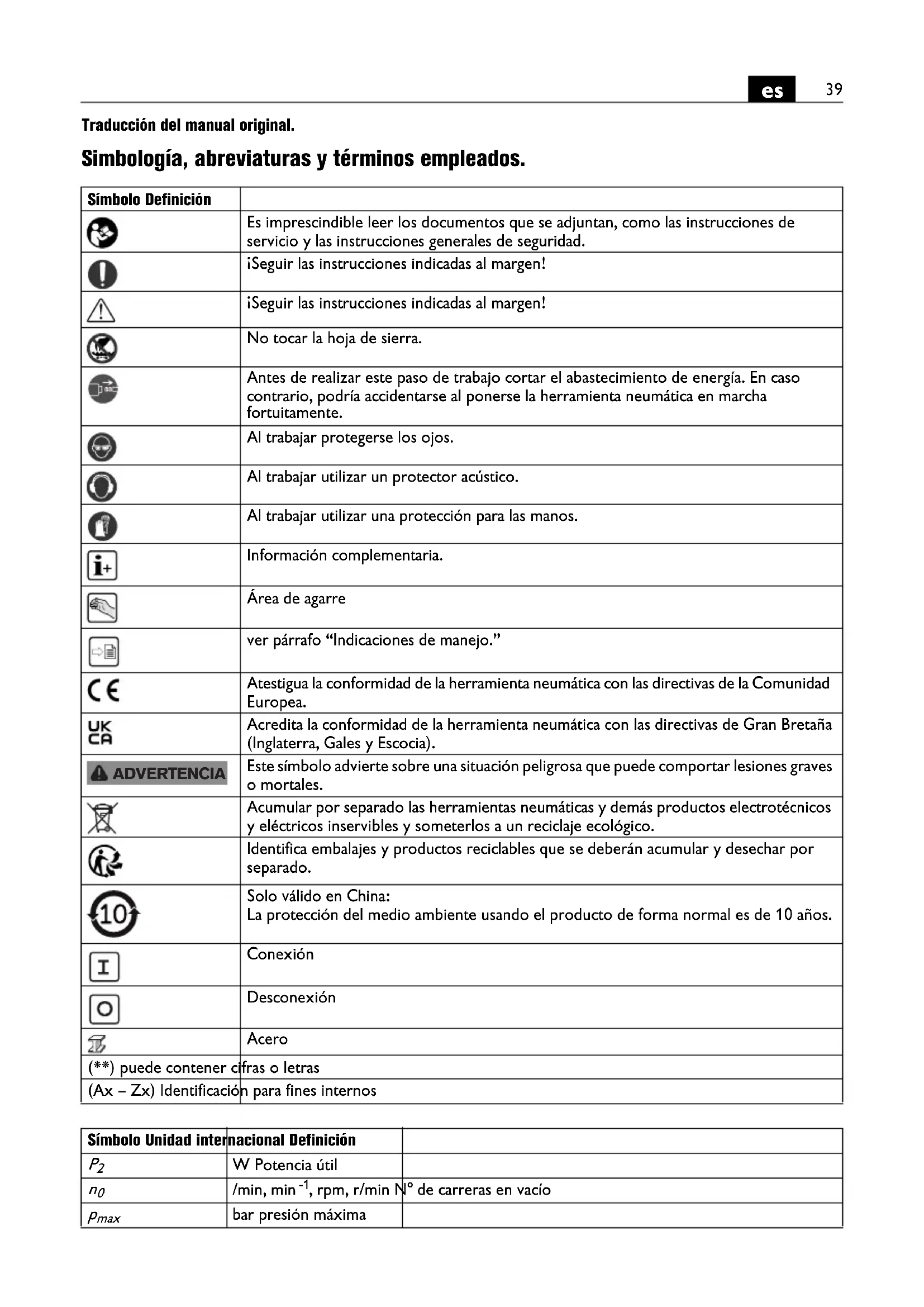 Traducción del manual original. Simbología, abreviaturas y términos empleados. Símbolo Definición Es imprescindible leer los documentos que se adjuntan, como las instrucciones de servicio y las instrucciones generales de seguridad. ¡Seguir las instrucciones indicadas al margen! ¡Seguir las instrucciones indicadas al margen! No tocar la hoja de sierra. Antes de realizar este paso de trabajo cortar el abastecimiento de energía. En caso contrario, podría accidentarse al ponerse la herramienta neumática en marcha fortuitamente. Al trabajar protegerse los ojos. Al trabajar utilizar un protector acústico. Al trabajar utilizar una protección para las manos. Información complementaria. Área de agarre ver párrafo “Indicaciones de manejo.” Atestigua la conformidad de la herramienta neumática con las directivas de la Comunidad Europea. Acredita la conformidad de la herramienta neumática con las directivas de Gran Bretaña (Inglaterra, Gales y Escocia). Este símbolo advierte sobre una situación peligrosa que puede comportar lesiones graves o mortales. Acumular por separado las herramientas neumáticas y demás productos electrotécnicos y eléctricos inservibles y someterlos a un reciclaje ecológico. Identifica embalajes y productos reciclables que se deberán acumular y desechar por separado. Solo válido en China: La protección del medio ambiente usando el producto de forma normal es de 10 años. Conexión Desconexión Acero (**) puede contener cifras o letras (Ax – Zx) Identificación para fines internos ADVERTENCIA Símbolo Unidad internacional Definición