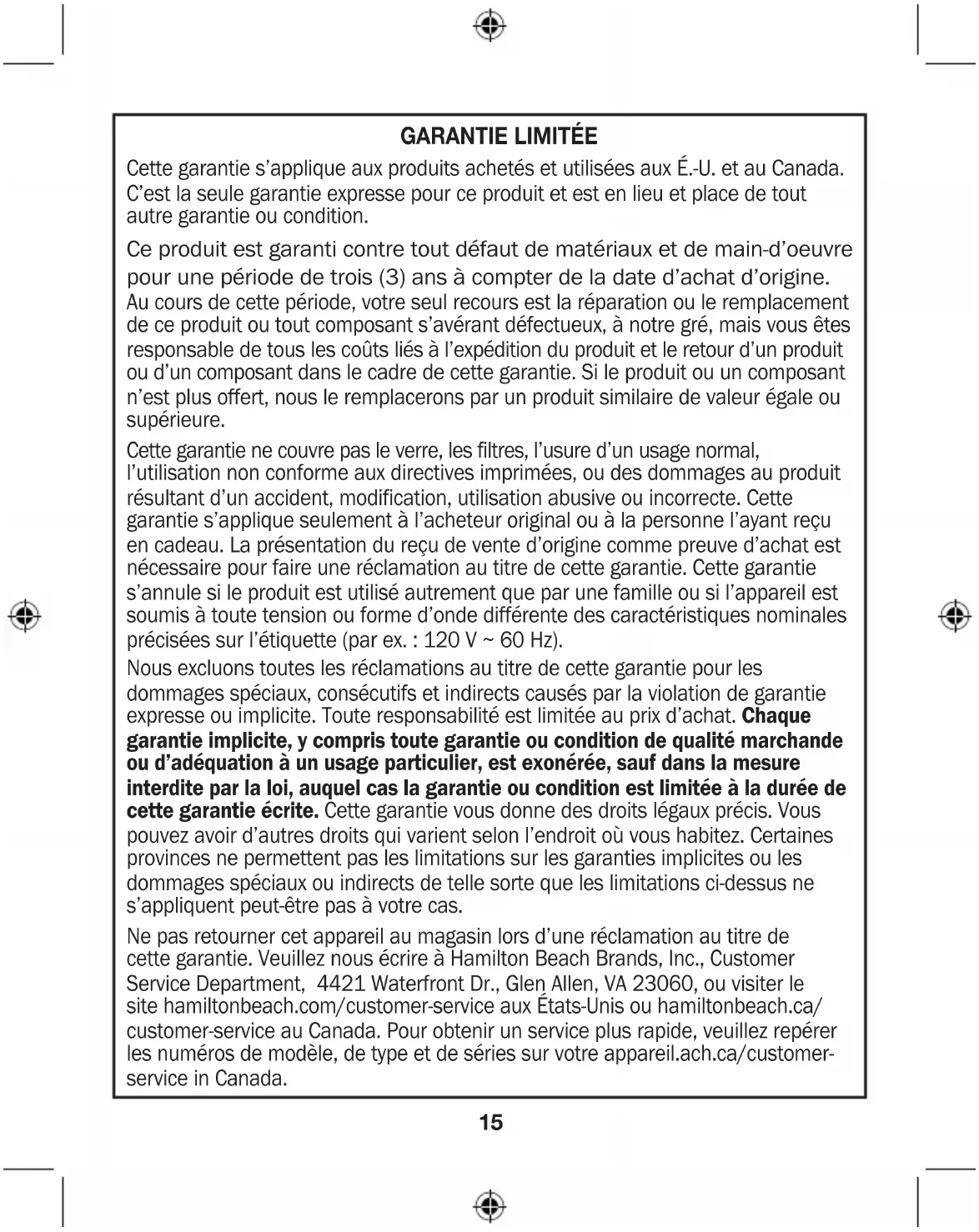 enrolle el cable lrededor del aparato mientras esté caliente. Este aparato ha sido diseñado solamente para uso doméstico w ADVERTENCIA Peligro de Descarga Eléctrica: Este producto es provisto con un enchufe polarizado (una pata más ancha) para reducir el riesgo de una descarga eléctrica. El enchufe embona únicamente en una dirección dentro de un tomacorriente polarizado. No trate de obviar el propósito de seguridad del enchufe modificándolo de alguna manera o utilizando un adaptador. Si el enchufe no entra completamente en la toma, invierta el enchufe. Si aún no entra, haga que un electricista reemplace la toma. El largo del cable que se usa en este aparato fue seleccionado para reducir el peligro de que alguien se enganche o tropiece con un cable más largo. Si es necesario usar un cable más largo, se podrá usar un cable de extensión aprobado. La clasificación eléctrica nominal del cable de extensión debe ser igual o mayor que la clasificación nominal del aparato. Es importante tener cuidado de colocar el cable de extensión para que no se pliegue sobre el mostrador o la mesera en donde niños puedan tirar del mismo o tropezarse accidentalmente. Para evitar una sobrecarga eléctrica del circuito, no use otro aparato de alto voltaje en el mismo circuito con este aparato. ¡GUARDE ESTAS INSTRUCCIONES! Otra Información de Seguridad para el Cliente18