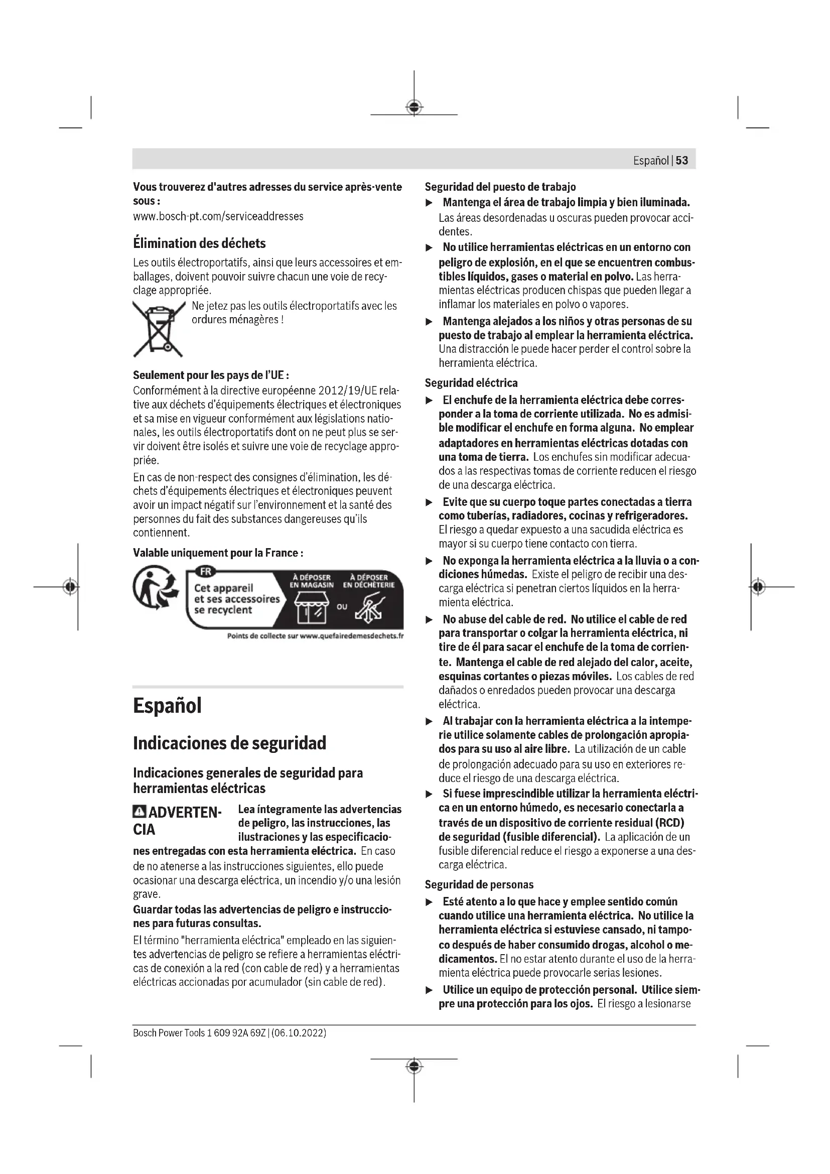 Los valores indicados de los escalones de números de revoluciones son valores de orientación. Montaje Montar el dispositivo protector u Antes de cualquier manipulación en la herramienta eléctrica, sacar el enchufe de red de la toma de co- rriente. Indicación: Tras la rotura del disco abrasivo durante el servi- cio o en caso de daño de los dispositivos de apoyo en la ca- peruza protectora/en la herramienta eléctrica, la herramien- ta eléctrica debe enviarse de inmediato al servicio técnico, ver las direcciones en el apartado "Servicio técnico y aten- ción al cliente". 1 609 92A 69Z | (06.10.2022) Bosch Power ToolsEspañol | 63 Cubierta protectora para amolar Coloque la cubierta protecto- ra (11) sobre el alojamiento en la herramienta eléctrica, hasta que coincidan las levas de codificación de la cubierta protectora con el alojamien- to. Presione y sujete en ello la palanca de desenclavamiento (1). Presione la cubierta protecto- ra (11) sobre el cuello del hu- sillo hasta que el collar de la cubierta protectora quede asentada en la brida de la he- rramienta eléctrica y gire la cubierta protectora, hasta que encastre de forma claramen- te audible. Adapte la posición de la caperuza protectora (11) a las nece- sidades del paso de trabajo. Para ello, presione la palanca de desenclavamiento (1) hacia arriba, y gire la cubierta pro- tectora (11) a la posición deseada. u Ajuste siempre la cubierta protectora(11) de modo que las levas de la palanca de desenclavamiento (1) encajen en las correspondientes aberturas de la cu- bierta protectora(11). u Ajuste la cubierta protectora (11) de modo que se evi- te una proyección de chispas en dirección del opera- dor. u ¡La cubierta protectora (11) sólo debe dejarse girar accionando la palanca de desenclavamiento (1) ! De lo contrario, la herramienta eléctrica no se debe seguir utilizado bajo ninguna circunstancia y debe entregar- se al servicio de atención al cliente. Indicación: Las levas de codificación en la cubierta protec- tora (11) garantizan que sólo se pueda montar una cubierta protectora adecuada para la herramienta eléctrica. Cubierta de aspiración para amolar Para los trabajos de amolado sin polvo, de pinturas, barnices y plásticos, en combinación con vasos de amolar de metal duro(15), puede utilizar la cubierta de aspiración(10). La cubierta de aspiración(10) no es adecuada para trabajos en metal. Puede conectarse un aspirador Bosch adecuado a la cubier- ta de aspiración(10). Para ello, introduzca la manguera de aspiración con el adaptador de aspiración en el racor de alo- jamiento previsto de la cubierta de aspiración. Cubierta protectora para tronzar u Utilice para tronzar siempre la cubierta protectora pa- ra tronzar(12) o la cubierta protectora para amolar (11) junto con la cubierta para tronzar (13). u En el caso de tronzar piedra, debe encargarse de una aspiración de polvo adecuada. La cubierta protectora para tronzar(12) se monta como la cubierta protectora para amolar(11). Cubierta para tronzar de metal Monte la cubierta para tronzar(13) de metal en la cubierta protectora para amolar(11) (ver figuraA): Gire hacia atrás el estribo de sujeción (➊). Coloque la cubierta(13) en la cu- bierta protectora para amolar(11) (➋). Presione firmemen- te el estribo de sujeción en la cubierta protectora(11) (➌). Para el desmontaje (ver figuraB), presione el botón en el es- tribo de sujeción (➊) y gírelo hacia atrás (➋). Retire la cubierta(13) de la cubierta protectora(11) (➌). Cubierta para tronzar de plástico Coloque la cubierta para tronzar(13) de plástico en la cu- bierta protectora para amolar(11) (ver figuraC). La cubierta(13) encaja de forma audible y visible en la cubierta protectora(11). Para el desmontaje (ver figuraD) desenclave la cubierta(13) en la cubierta protectora(11) (➊), a la iz- quierda o a la derecha, y retire la cubierta (➋). Cubierta de aspiración para tronzar con carro guía La cubierta de aspiración para tronzar con carro guía(34) se monta como la cubierta protectora para amolar. Mediante la fijación de la empuñadura adicional(8)/(9) a través del estribo en la cubierta de aspiración en la carcasa del engranaje, la herramienta eléctrica queda firmemente unida a la cubierta de aspiración. Puede conectarse un aspi- rador Bosch adecuado a la cubierta de aspiración con carro guía(34). Para ello, introduzca la manguera de aspiración con el adaptador de aspiración en el racor de alojamiento previsto de la cubierta de aspiración. Indicación: La fricción generada por el polvo en la manguera de aspiración y en los accesorios durante la aspiración causa una carga electrostática que el usuario puede sentir como una descarga estática (dependiendo de los factores ambien- tales y de su estado fisiológico). En general, Bosch reco- mienda el uso de una manguera de aspiración antiestática (accesorio) para aspirar polvo fino y materiales secos. Protección de las manos u Monte siempre la protección de las manos para los tra- bajos con el plato lijador de goma(27) o con el cepillo de corona/cepillo cónico/corona diamantada para ta- ladrar (26). Fije la protección de las manos(26) con la empuñadura adicional(8)/(9). Empuñadura adicional estándar/empuñadura adicional amortiguadora de vibraciones Atornille la empuñadura adicional(8)/(9), dependiente de la modalidad de trabajo, a la derecha o la izquierda de la ca- beza del engranaje. u Utilice su herramienta eléctrica sólo con la empuñadu- ra adicional (8)/(9). u No siga utilizando la herramienta eléctrica, si la empu- ñadura adicional (8)/(9) está dañada. No haga ningu- na modificación en la empuñadura adicional (8)/(9). La empuñadura adicional antivibratoria(9) amortigua las vibraciones, lo cual per- Bosch Power Tools 1 609 92A 69Z | (06.10.2022)64 | Español mite trabajar de forma más cómoda y segura. Montar útiles abrasivos u Antes de cualquier manipulación en la herramienta eléctrica, sacar 