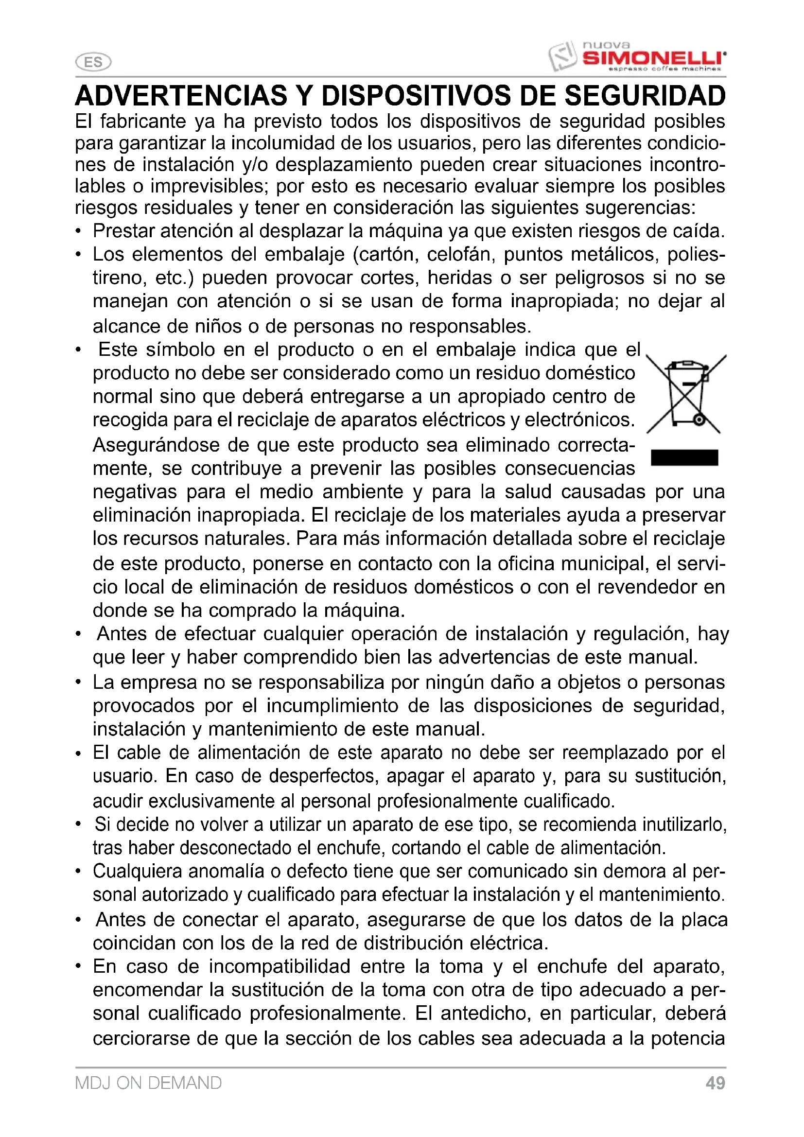El manual está destinado al usuario y/o al encargado de mantenimiento de la máquina y se forma parte de esta. El presente manual tiene la función de facilitar toda la información para un uso correcto de la máquina y un adecuado mantenimiento, así como para tutelar la seguridad del operador. El manual debe ser conservado por toda la vida de la máquina y debe cederse a cualquier otro usuario o siguiente propietario. Las indicaciones que figuran en este manual no reemplazan las disposiciones de seguridad y los datos técnicos para la instalación y el funcionamiento colo- cados en la máquina y en los embalajes. El presente manual refleja el estado de la técnica en el momento actual y no podrá considerarse inadecuado solo porque se actualice sucesivamente a raíz de nuevas experiencias. El fabricante se reserva el derecho a modificar el manual sin tener la obligación de actualizar las ediciones precedentes, excepto que en casos excepcionales. Un uso inapropiado de la máquina o disconforme con lo indicado en el presente manual anula toda garantía o responsabilidad del fabricante; el uso está reser- vado a una persona adulta y responsable. Es necesario conservar con cuidado el presente manual ya que el fabricante no responde por daños causados a cosas y personas, o sufridos por la máquina si se utiliza de manera diferente a lo indicado en el manual y si no se respetan las disposiciones de mantenimiento y seguridad.