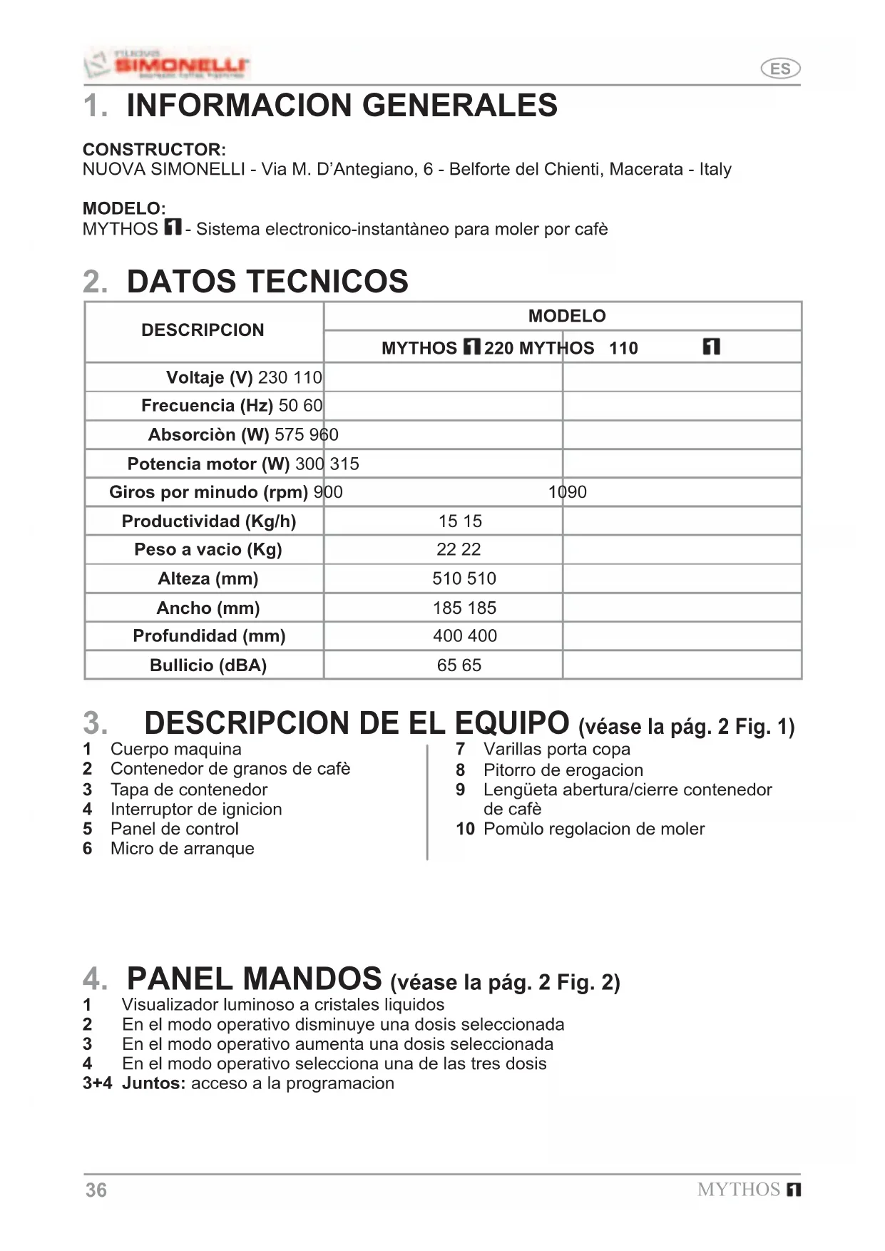 MYTHOS El cable de alimentacion de este equipo no debe ser reemplazado por el utilizador. En caso de daños, apagar el equipo y por la sustitucion dirigirse exclusivamente a personal profesionalmente calificado. Cuando se decide de no utilizar mas el equipo se recomenda que no sea mas utilizable, quitar del enchufe el cable de alimentacion y cortarlo. Cualquiera anomalia o defecto tiene que ser en seguida señalado al personal autorizado y calificado por efectuar la instalacion y la manutencion. Antes de conectar el equipo asegurarse que los datos de la placa sean los mismos a aquellos de red de distribucion electrica. En caso que sean incompatibles el enchufe con la espina del equipo se tiene que substituir el enchufe con otra justa echo por personal profesionalmente calificado. Esto, en particular, se necesita averiguar que las secciones de los cables sean idoneos a la potencia que absorbe el equipo. Esta consejado el utilizo de adaptadores de espinas y/o alargadores. Es obligatorio la conexion a la tierra, y la correspondencia de la instalacion con las nor- mas vigentes en el pais de instalacion. La instalacione de la maquina debe ser efectuada por personal autorizado y calificado. Averiguar la integridad de los componentes y, cuando pasen defectos o anomalias, sus- pender la instalacion y pedir la substitucion de la misma.