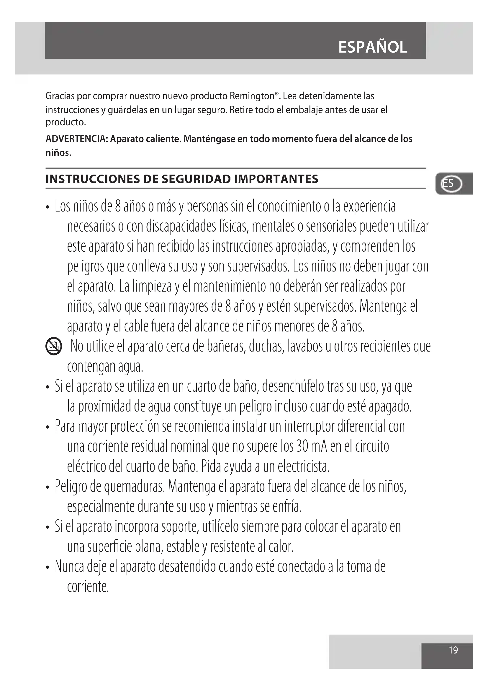 - A fin de evitar riesgos, si el cable resultase dañado, deje de utilizar el aparato inmediatamente y devuélvalo al distribuidor autorizado de Remington® más cercano para su reparación o sustitución.