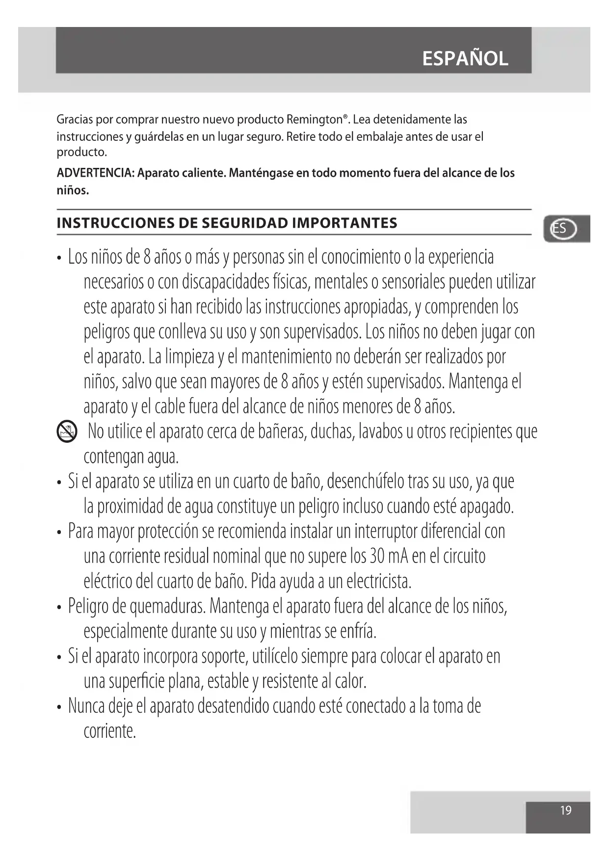 - A fin de evitar riesgos, si el cable resultase dañado, deje de utilizar el aparato inmediatamente y devuélvalo al distribuidor autorizado de Remington® más cercano para su reparación o sustitución.