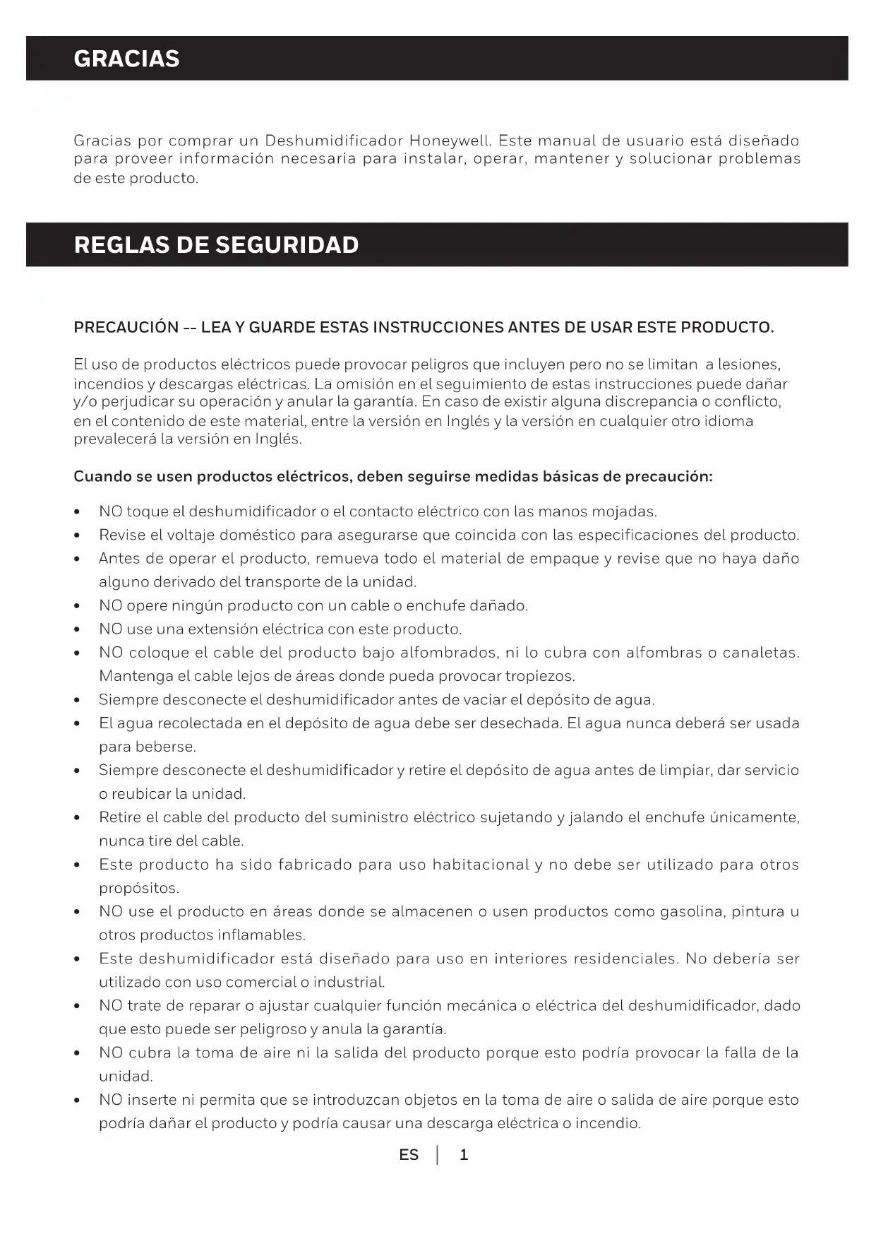 Gracias por comprar un Deshumidificador Honeywell. Este manual de usuario está diseñado para proveer información necesaria para instalar, operar, mantener y solucionar problemas de este producto. PRECAUCIÓN -- LEA Y GUARDE ESTAS INSTRUCCIONES ANTES DE USAR ESTE PRODUCTO. El uso de productos eléctricos puede provocar peligros que incluyen pero no se limitan a lesiones, incendios y descargas eléctricas. La omisión en el seguimiento de estas instrucciones puede dañar y/o perjudicar su operación y anular la garantía. En caso de existir alguna discrepancia o conflicto, en el contenido de este material, entre la versión en Inglés y la versión en cualquier otro idioma prevalecerá la versión en Inglés. Cuando se usen productos eléctricos, deben seguirse medidas básicas de precaución: