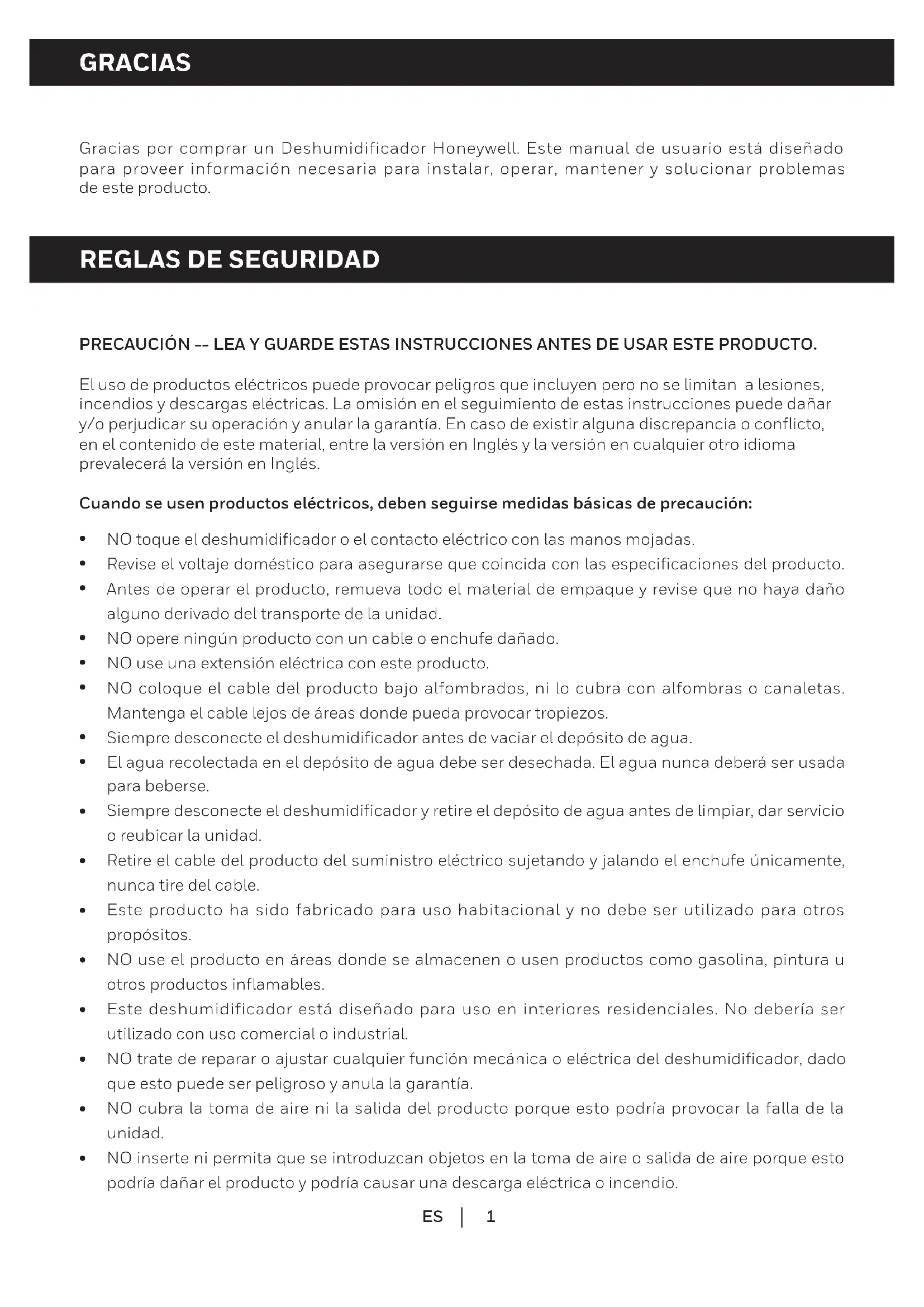 Gracias por comprar un Deshumidificador Honeywell. Este manual de usuario está diseñado para proveer información necesaria para instalar, operar, mantener y solucionar problemas de este producto. PRECAUCIÓN -- LEA Y GUARDE ESTAS INSTRUCCIONES ANTES DE USAR ESTE PRODUCTO. El uso de productos eléctricos puede provocar peligros que incluyen pero no se limitan a lesiones, incendios y descargas eléctricas. La omisión en el seguimiento de estas instrucciones puede dañar y/o perjudicar su operación y anular la garantía. En caso de existir alguna discrepancia o conflicto, en el contenido de este material, entre la versión en Inglés y la versión en cualquier otro idioma prevalecerá la versión en Inglés. Cuando se usen productos eléctricos, deben seguirse medidas básicas de precaución: