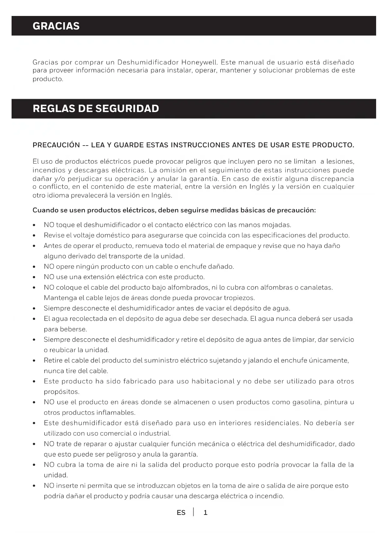 Gracias por comprar un Deshumidificador Honeywell. Este manual de usuario está diseñado para proveer información necesaria para instalar, operar, mantener y solucionar problemas de este producto. PRECAUCIÓN -- LEA Y GUARDE ESTAS INSTRUCCIONES ANTES DE USAR ESTE PRODUCTO. El uso de productos eléctricos puede provocar peligros que incluyen pero no se limitan a lesiones, incendios y descargas eléctricas. La omisión en el seguimiento de estas instrucciones puede dañar y/o perjudicar su operación y anular la garantía. En caso de existir alguna discrepancia o conflicto, en el contenido de este material, entre la versión en Inglés y la versión en cualquier otro idioma prevalecerá la versión en Inglés. Cuando se usen productos eléctricos, deben seguirse medidas básicas de precaución: