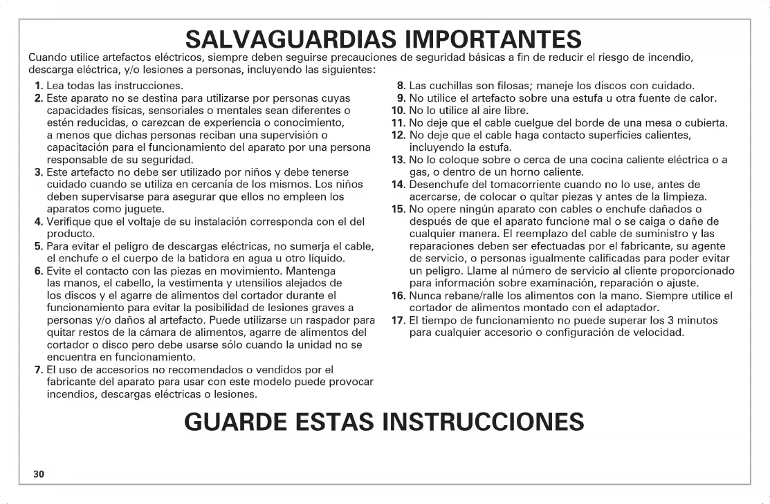 la cámara de alimentos, el agarre de alimentos del cortador y los discos en agua caliente jabonosa. Para evitar lesiones provocadas por las cuchillas de los discos, nunca los coloque en el fregadero con agua jabonosa donde no queden visibles.