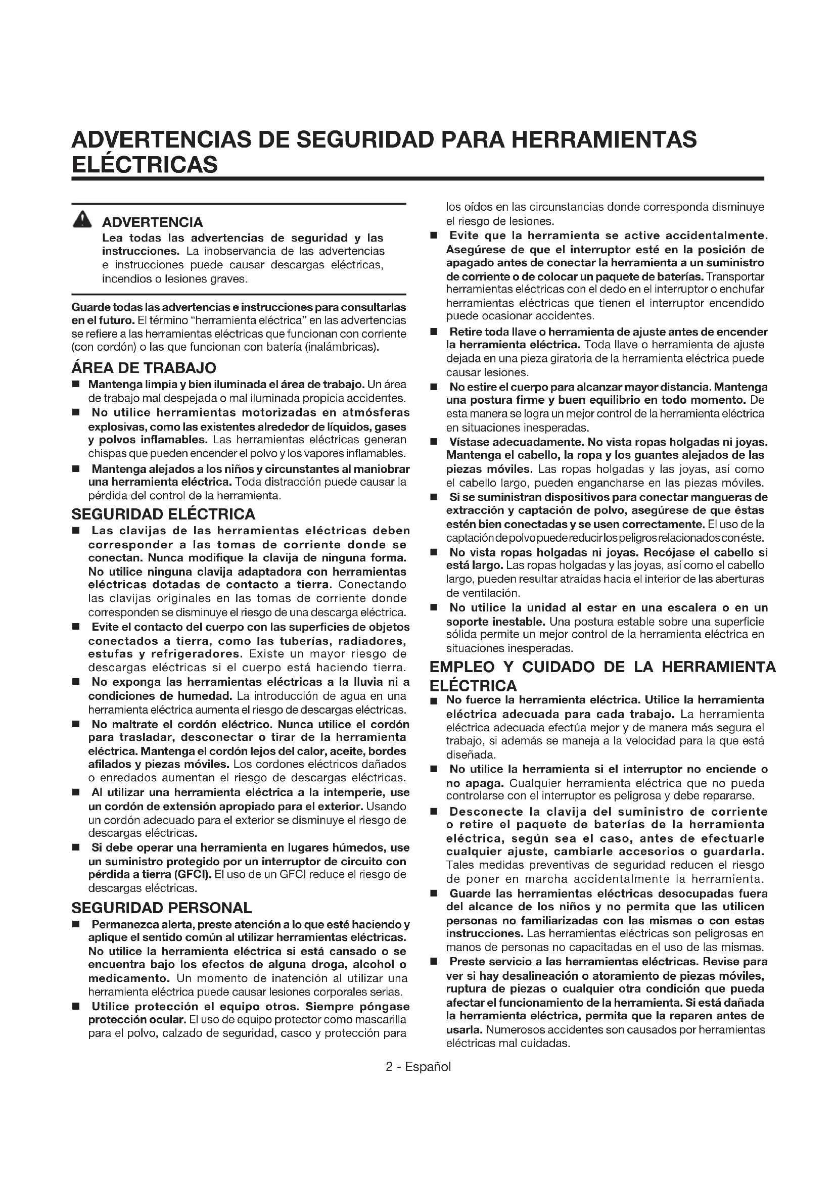 ELÉCTRICAS Mantenga las herramientas de corte afiladas y limpias. Las herramientas de corte bien cuidadas y con bordes bien afilados, tienen menos probabilidad de atascarse en la pieza de trabajo y son más fáciles de controlar. Utilice la herramienta eléctrica, los accesorios y brocas, hojas y cuchillas de corte, ruedas de esmeril, etc. de conformidad con estas instrucciones, tomando en cuenta las condiciones de trabajo y la tarea por realizar. Si se utiliza la herramienta eléctrica para operaciones diferentes de las indicadas podría originar una situación peligrosa. SERVICIO Permita que un técnico de reparación calificado preste servicio a la herramienta eléctrica, y sólo con piezas de repuesto idénticas. De esta manera se mantiene la seguridad de la herramienta eléctrica. Al dar servicio a una herramienta eléctrica, sólo utilice piezas de repuesto idénticas. Siga las instrucciones señaladas en la sección Mantenimiento de este manual. El empleo de piezas no autorizadas o el incumplimiento de las instrucciones de mantenimiento puede significar un riesgo de descarga eléctrica o de lesiones.de descarga eléctrica o de lesiones.