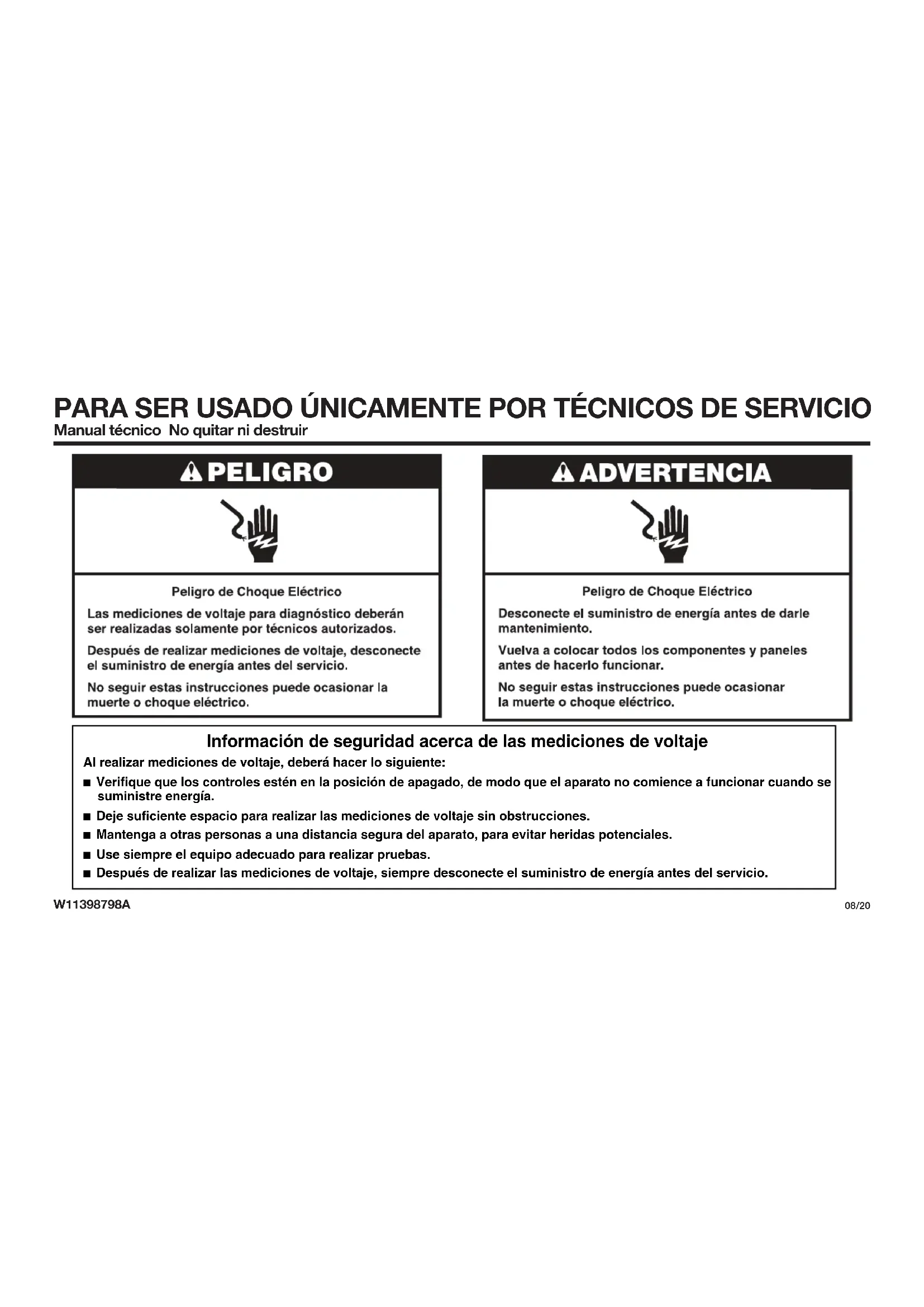 l’alimentation électrique. Normal = 48Ω Anormal = Résistance innie AÀ L’USAGE DU TECHNICIEN DE MAINTENANCE SEULEMENT 08/20 À L’USAGE DU TECHNICIEN DE MAINTENANCE SEULEMENT W11398798A ©2020 Tous droits réservés. Pour toute information sur les brevets, consulter le Pat au www.patent-listing.com W11398798A REMARQUE: Cette che contient des données techniques importantes. À L’USAGE DU TECHNICIEN SEULEMENT, NE PAS ENLEVER OU DÉTRUIREPARA SER USADO ÚNICAMENTE POR TÉCNICOS DE SERVICIO Manual técnico No quitar ni destruir W11398798A 08/20 Información de seguridad acerca de las mediciones de voltaje Al realizar mediciones de voltaje, deberá hacer lo siguiente: ■ Verifique que los controles estén en la posición de apagado, de modo que el aparato no comience a funcionar cuando se suministre energía. ■ Deje suficiente espacio para realizar las mediciones de voltaje sin obstrucciones. ■ Mantenga a otras personas a una distancia segura del aparato, para evitar heridas potenciales. ■ Use siempre el equipo adecuado para realizar pruebas. ■ Después de realizar las mediciones de voltaje, siempre desconecte el suministro de energía antes del servicio.PARA SER USADO ÚNICAMENTE POR TÉCNICOS DE SERVICIO